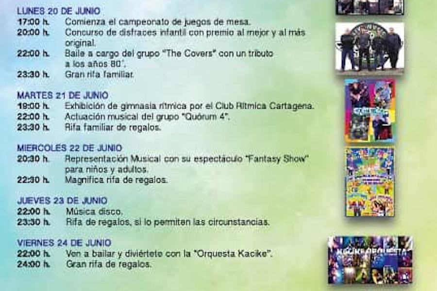 Ofrecemos el programa de actos de lunes a viernes, en el que, entre otros alicientes, figuran las actuaciones musicales de 'The Covers', 'Quórum 4' y orquesta 'Kacike'.