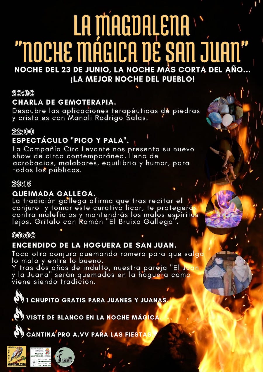 La mágica noche de San Juan volverá a ser especial en La Magdalena con un programa que comenzará a las 20.30 horas con una charla de gemoterapia a la que sucederán una actuación de la compañía ‘Circ Levante’, la elaboración de una queimada con sus conjuros y el encendido de la hogareta, en la que arderan Juan y Juan tras dos años de indulto. Se pide a los asistentes acudir con vestuario de color blanco.