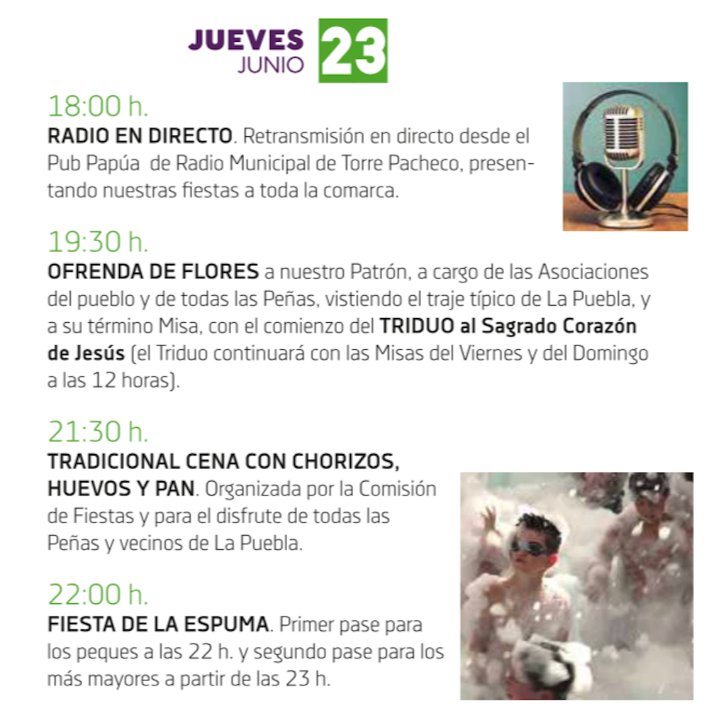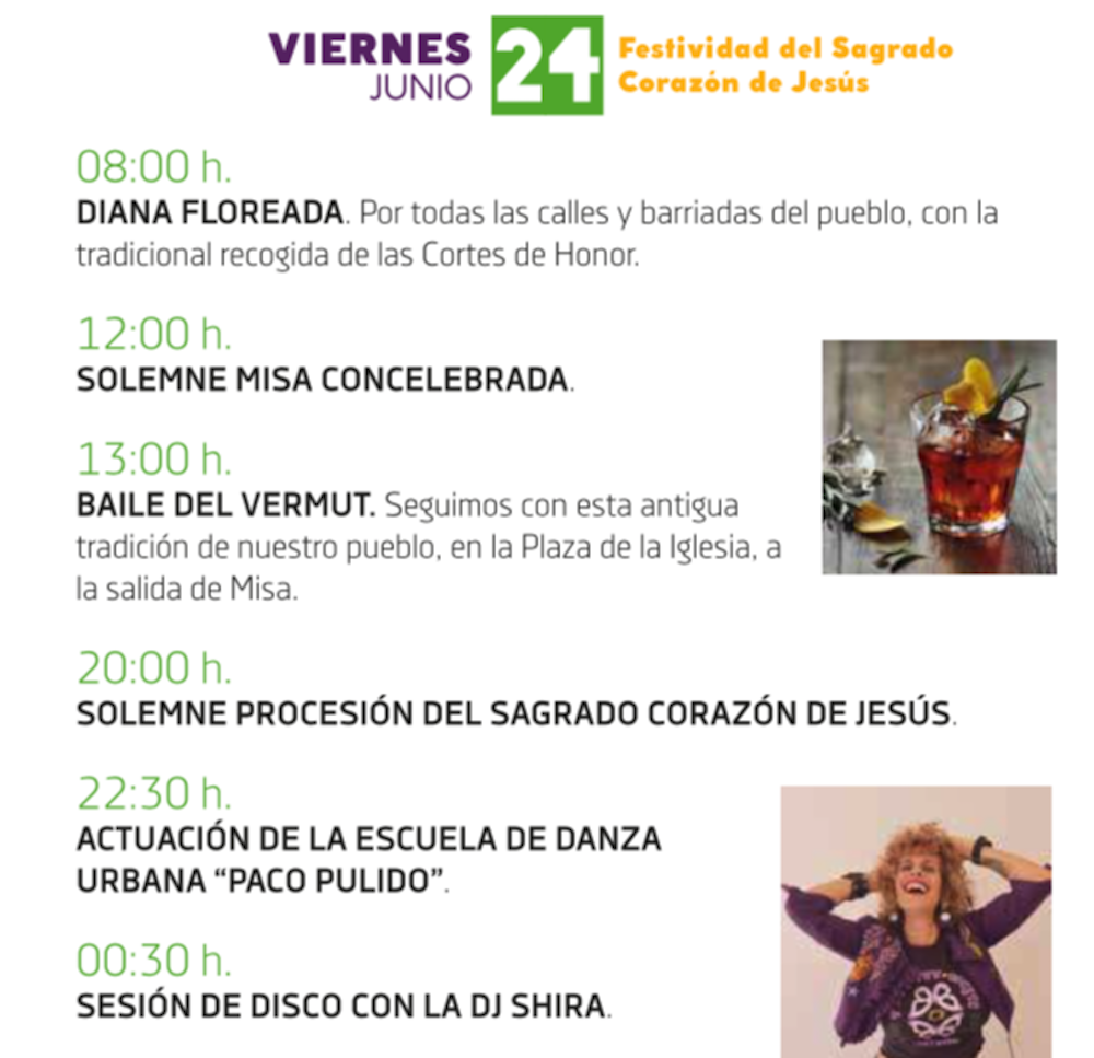 El programa de los festejos patronales de hoy incluye la cena con chorizos y huevos, además de la fiesta de la espuma. Otro atractivo es la ofrenda de flores al Sagrado Corazón de Jesús en la víspera de mañana, que es el día grande con misa y procesión, además de baile del vermú, actuación de escuela de danza y noche con la dj Shira.