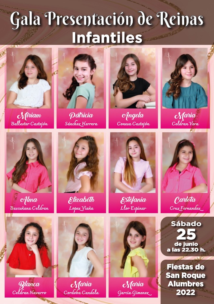 Las Fiestas Patronales de Alumbres vuelven con importantes novedades, siendo la primera que, por petición de las candidatas, este año no ha habido elección de reinas y majas, sino que todas lucirán la corona. En concreto, son 6 mayores y 11 infantiles de entre 8 y 11 años de edad, de las que 5 son del años 2020, 2 del año 2021 y 4 del presente.