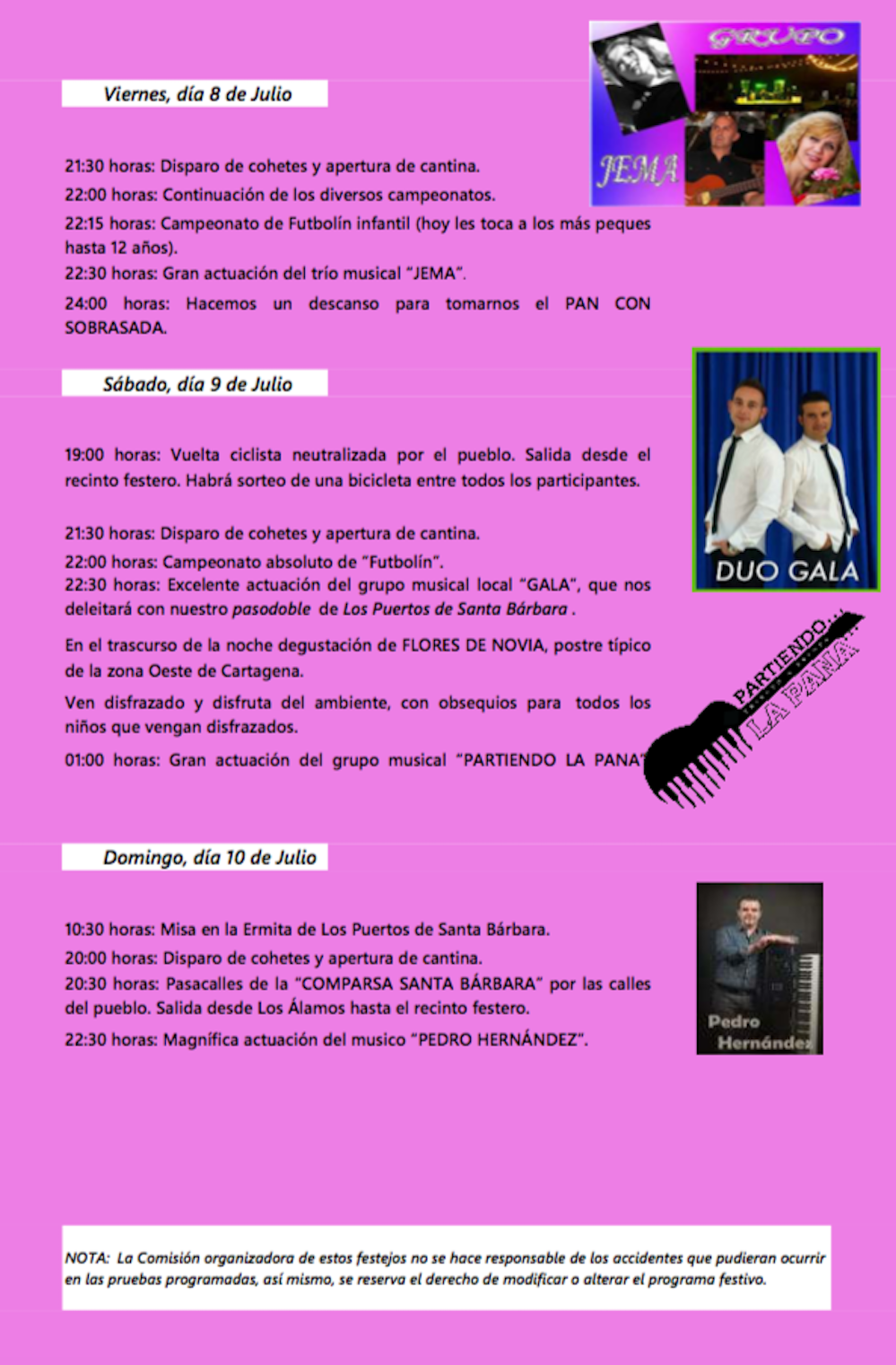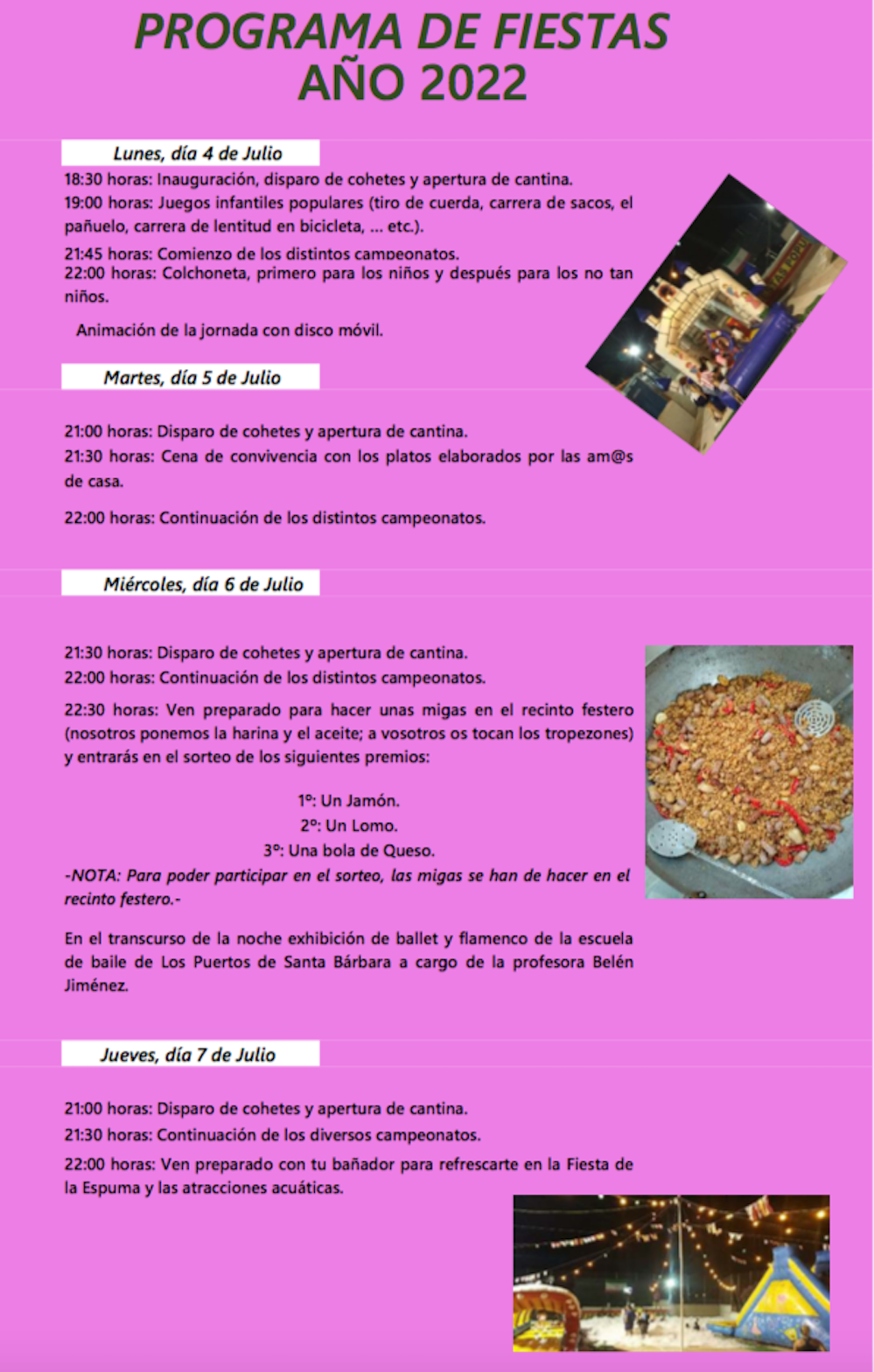 La asociación de vecinos organiza los festejos populares del 4 al 10 de julio con un interesante propuesta que incluye, además de actividades infantiles, deportivas y convivencias, una noche de migas con exhibición de ballet y flamenco, atracciones acuáticas, velada de disfraces, degustación de ‘flores de novia’ y actuaciones musicales de Jema, Gala, Pedro Hernández y ‘Partiendo la pana’, además de un pasacalles con la comparsa carnavalera local.