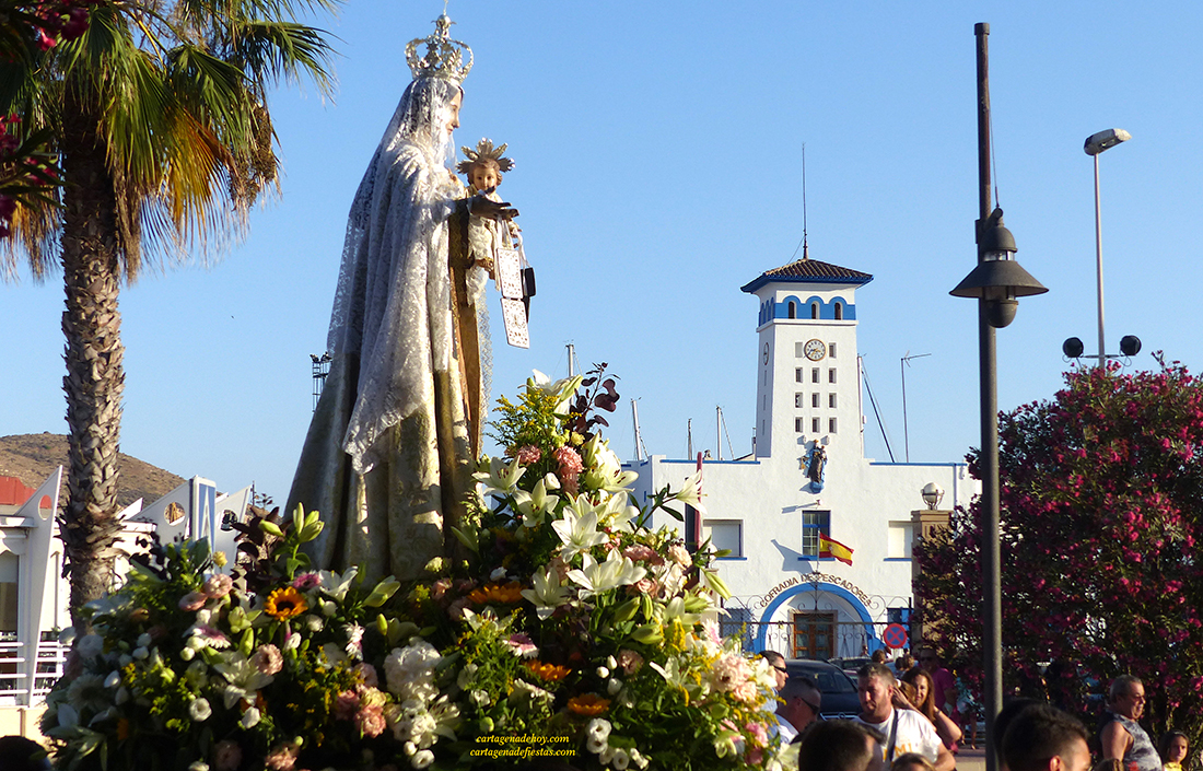 19.30 horas. Gran procesión marinera, con traslado de la Virgen del Carmen desde la iglesia hasta el muelle pesquero para acto seguido, y en la embarcación 'Nuevo Menestreo', con una escolta de gran número de embarcaciones realizar el tradicional recorrido por el puerto de Cartagena. Siguiendo la tradición será arrojado al mar un ramo de flores como homenaje póstumo a los fallecidos en el mar. El centro de buceo de la Armada colaborará con la seguridad en el mar.