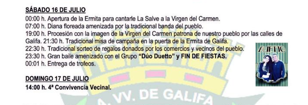 El pueblo del oeste cartagenero inicia esta próxima medianoche, con la apertura de la ermita para cantar la Salve, la gran jornada en honor a la Virgen del Carmen, que por la tarde tarde saldrá en procesión y presidirá la misa de campaña. Por la noche, baile con el grupo Duetto en el recinto festero del polideportivo y fin de fiestas, aunque quedará una convivencia vecinal para el domingo.