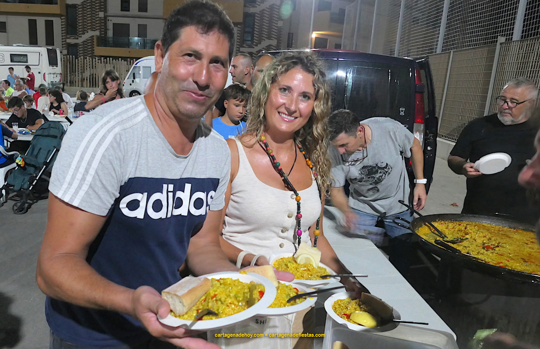 Anoche el aliciente era un gran arroz, en lo que (s.e.u.o.) es la primera vez que se sirve en unas fiestas populares de Cartagena de noche, pues lo habitual es hacerlo a mediodía, pero, quizás, por los calores de este verano se pensó en que podría pasarse a la noche y resultó un éxito, pues fueron más de ciento cincuenta las personas que recogieron su plato de arroz con carne y pimientos, entre otros productos. Durante la elaboración y el reparto, la música de Laidy Luna amenizó una velada que también ofreció bastantes bailes en pareja.