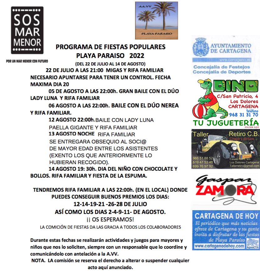 • Juguetes Dino, Taller El Retiro, concejalía de Festejos y Deportes, Gaspar Zamora y Cartagena de Hoy, entre los colaboradores de las fiestas populares