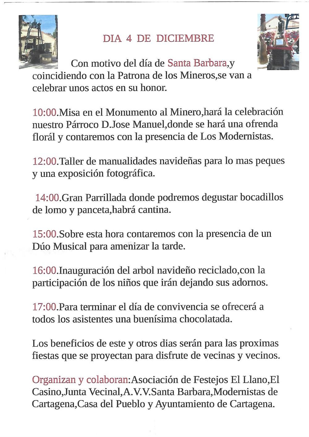 La actividad preparada por los colectivos del pueblo para este domingo comenzará a las diez horas con una misa junto al monumento al minero con ofrenda floral y presencia del colectivo de modernistas. La jornada continuará con manualidades navideñas, parrillada, música en directo, inauguración del árbol navideño y convivencia con chocolatada. Los beneficios de la jornada se destinará a las fiestas de 2023.