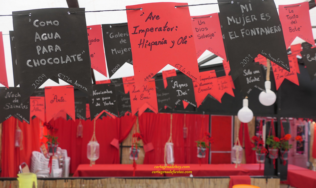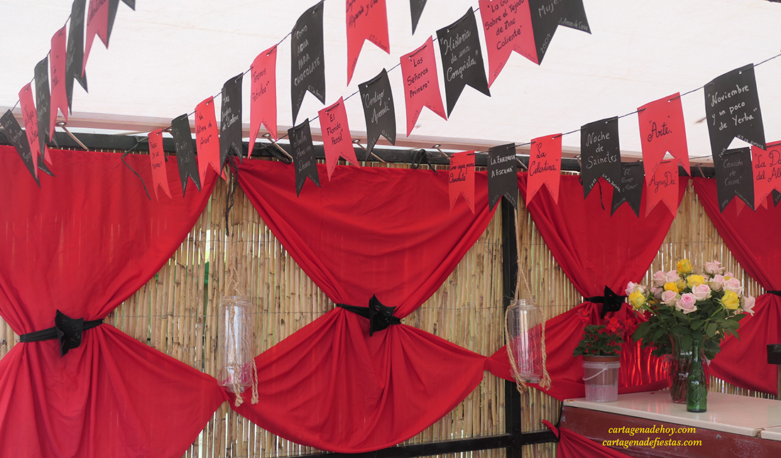 El grupo de teatro La Aurora ha adornado su recinto de las Fiestas de Primavera de Pozo Estrecho con banderolas en las que figuran los nombres de representaciones teatrales que han participado en su certamen, que este año ha cumplido 28 ediciones.