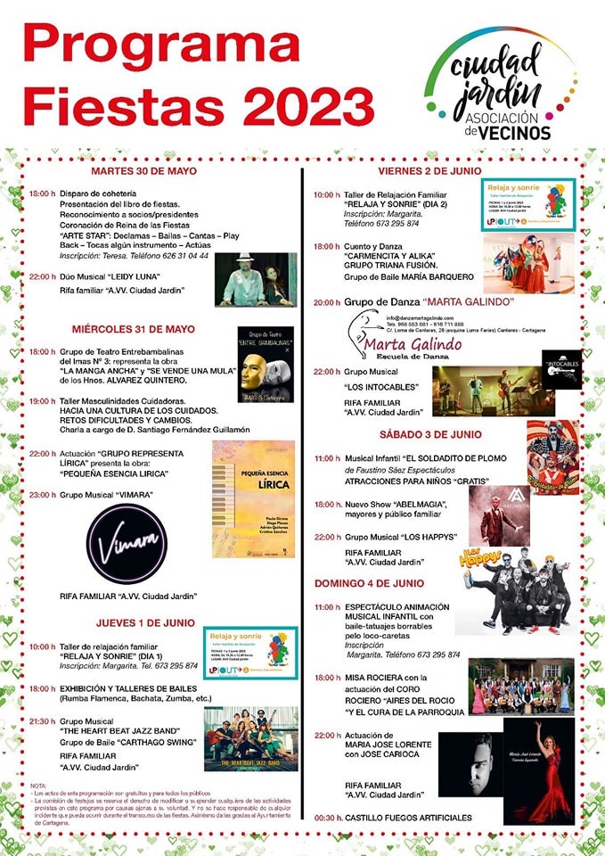 Leidy Luna, Vimara, ‘The Heart Beat Jazz Band’ (foto adjunta), ‘Los intocables’, ‘Los Happys’, ‘Aires del rocío’, María José Lorente y José Carioca protagonizarán el capítulo musical dentro de una programación que se desarrollará en la barriada del 30 de mayo al 4 de junio y que también ofrecerá teatro talleres, exhibiciones, rifas familiares, danza, cuentos, magia…