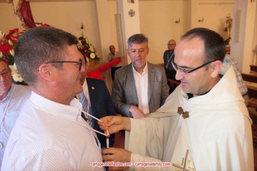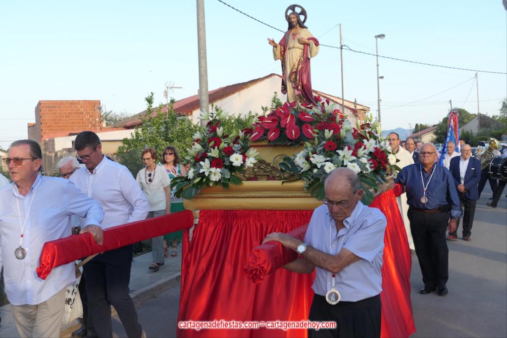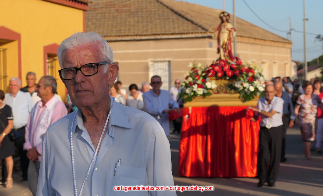 Va a comenzar la procesión y el sacerdote lleva a cabo la imposición de medallas dentro de la iglesia, donde nos llama la atención que las cuatro personas que empujan al trono de ruedas que lleva al Sagrado Corazón son vecinos de avanzada edad, lo que es distinto a lo visto en otras localidades. Preguntamos quién es el mayor y resulta que esta vez no va con el trono, sino lanzando los cohetes junto al presidente de la comisión de fiestas. Se llama Carlos Campillo y tiene 89 años de edad. “Soy nacido aquí y conozco las fiestas desde muy pequeño”, nos dice, además de apuntar que los festejos han sufrido notables cambios con el paso de los años. Con la imagen también tiene una relación especial, pues además de sacarla en procesión, hace unos siete año construyó el trono sobre el que avanza la imagen.