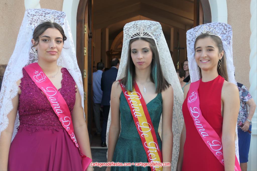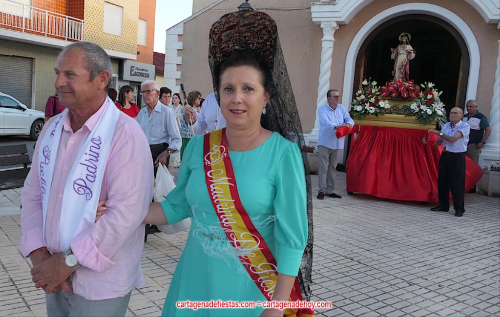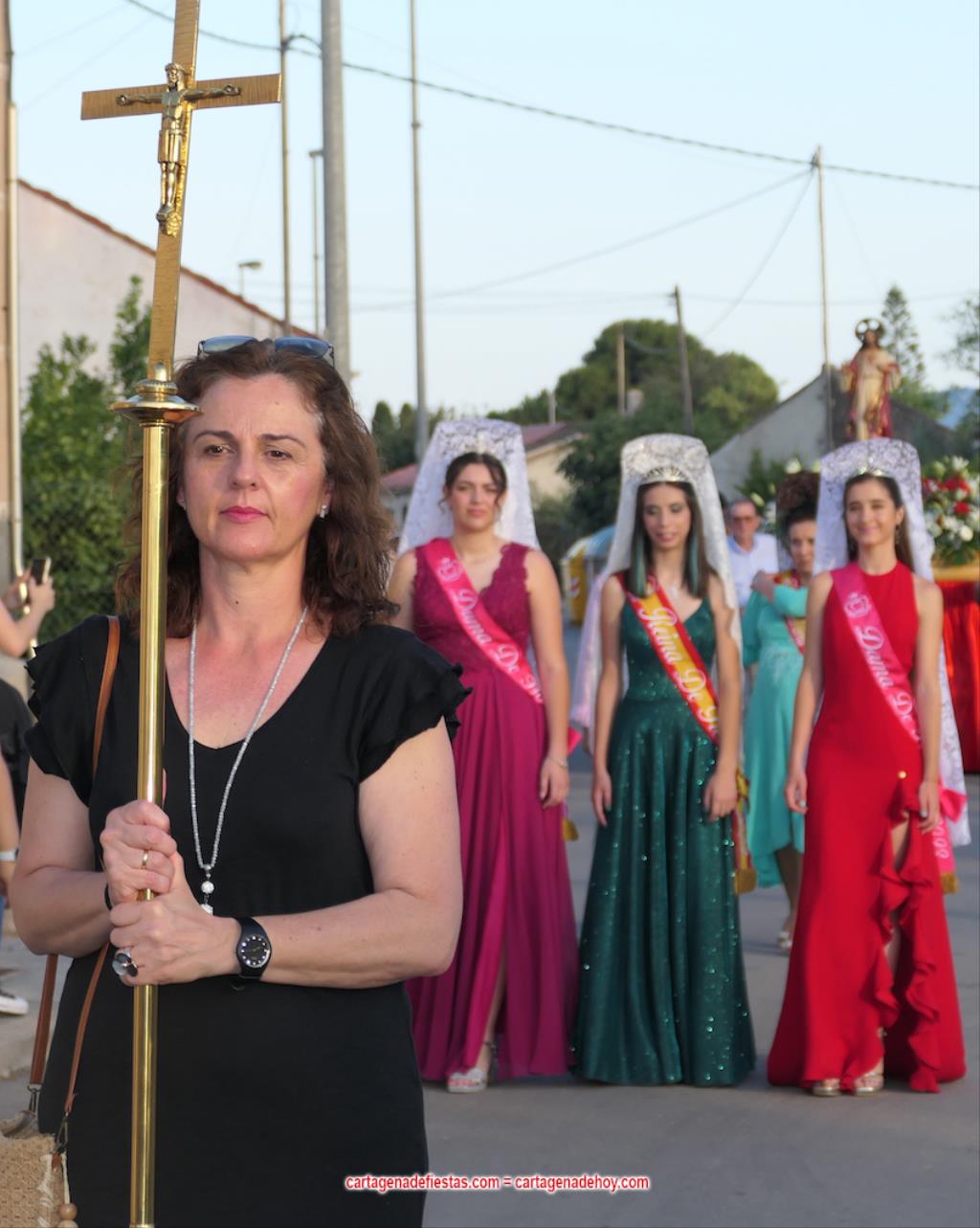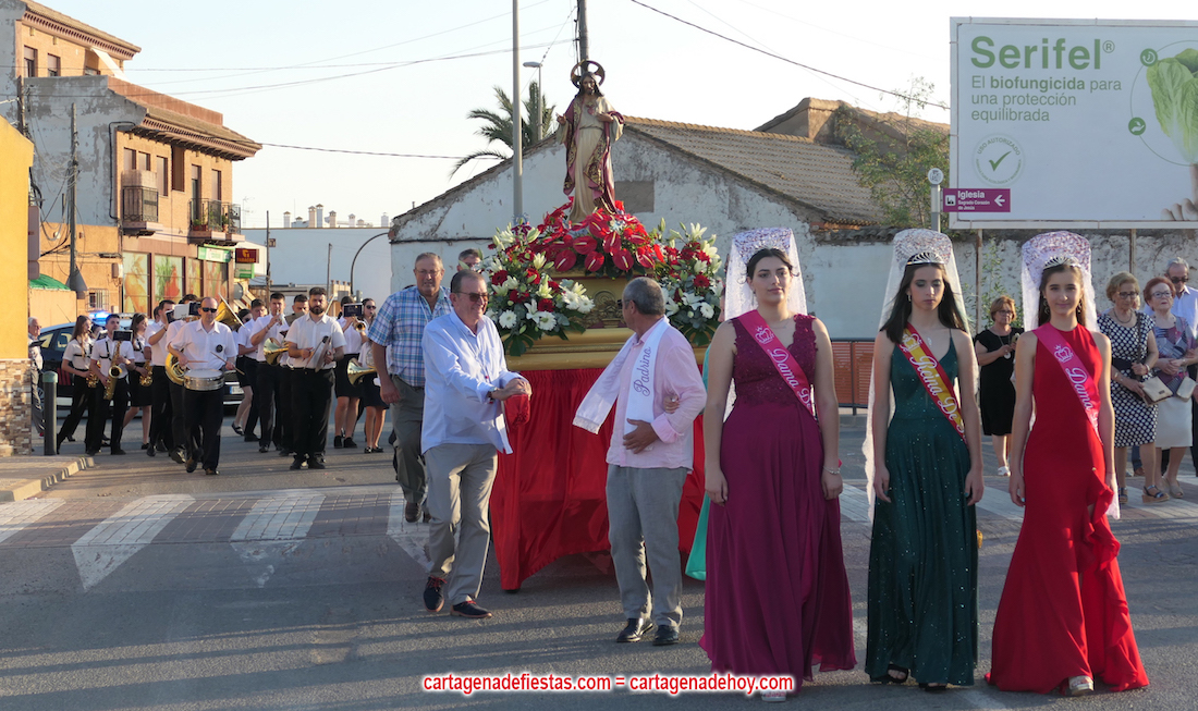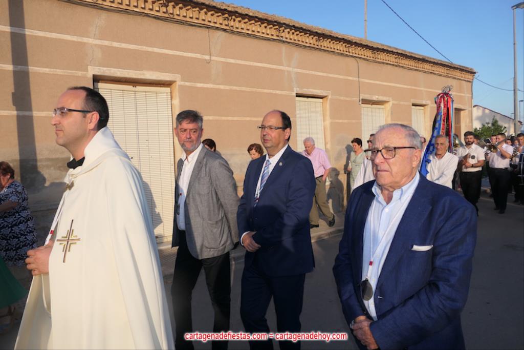 La procesión celebrada ayer fue encabezada por la reina y damas de las fiestas de este año, siendo la banda de música de la pachequera localidad de El Pasico la que animó la marcha, en la que también iban el párroco y los presidentes de la Junta Vecinal Municipal y Asociación de Vecinos y el hermano mayor de la Cofradía del Cristo de la Sangre, entre otros, siendo los devotos vecinos los que formaron sendas hileras de acompañamiento en los laterales del patrono.