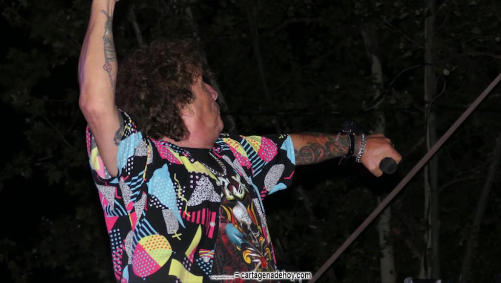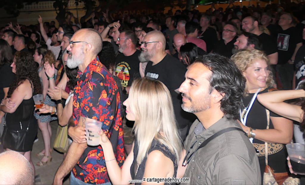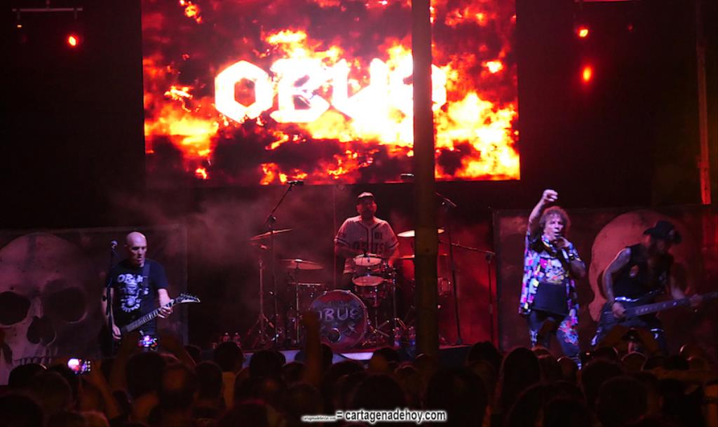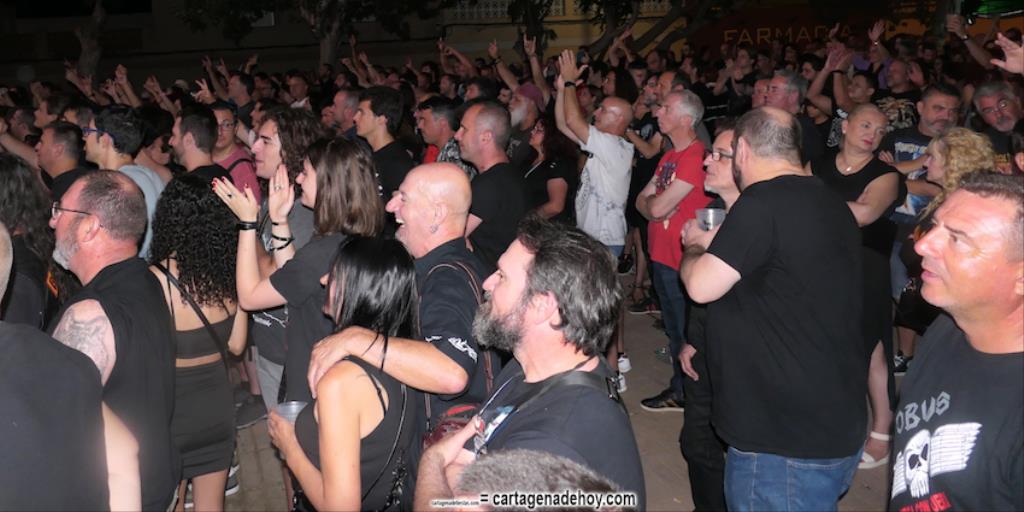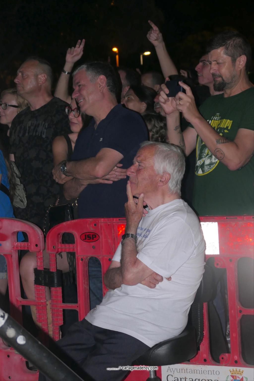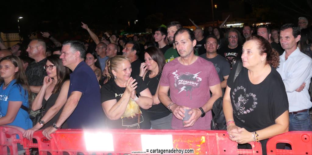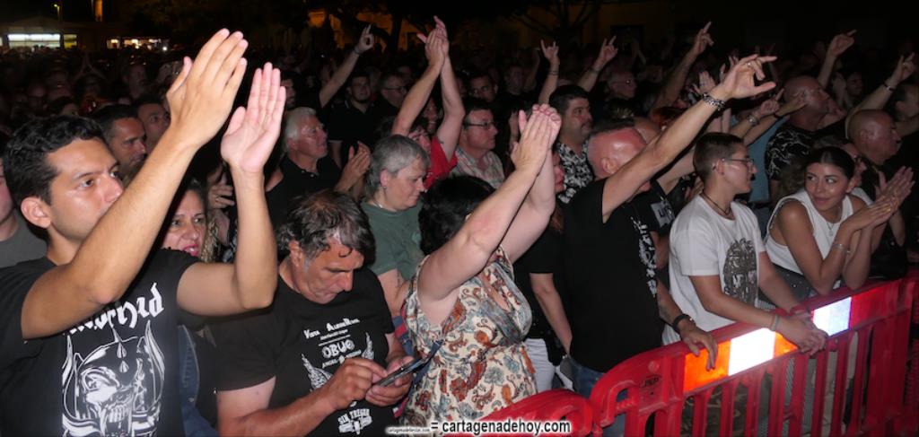 Vamos al capítulo musical, que comenzó sobre las diez y media de la noche y alcanzó las cuatro de una madrugada en la que, poco después, regresó la lluvia a Cartagena. Estupendas actuaciones de ‘Sin tregua’, ‘Sharabia’ y ‘Ángel Negro’, que también tienen a sus fieles conquistados merced a su buenhacer y calidad sonora, dentro de las variantes del rock que ofrecieron. Minutos antes de las dos de la madrugada apareció el cuarteto de ‘Obús’, siendo el último en subir al escenario un Fortu con camisa colorida, lo que contrastó en un ambiente donde la mayoría lucían las tradicionales camisetas negras. Comenzó con “Necesito más” y no faltó en su repertorio el súperconocido ‘Va a estallar el obús’ ni el ‘Dinero, dinero’ o el ‘Que te jodan’. Maestro sobre las tablas, fue puntal en mantener el júbilo entre el público. “¡¿Dónde estamos?!”, preguntaba a gritos. Unos decían que en Cartagena y otros que en Vista Alegre. Pues no… “¡Estamos en un concierto de rock…, arriba las manos!”.
