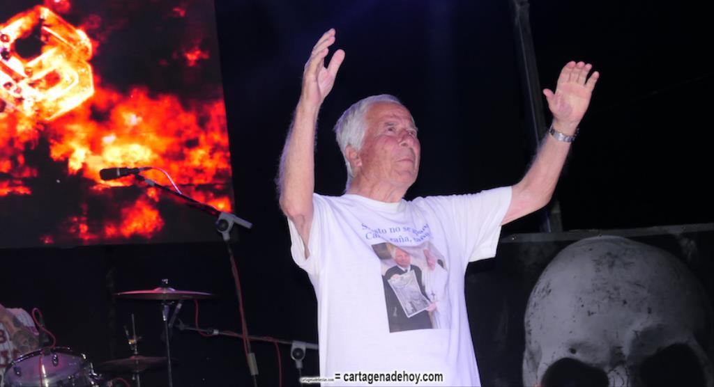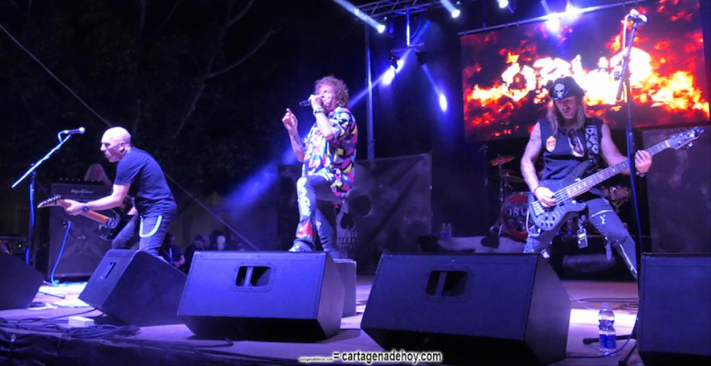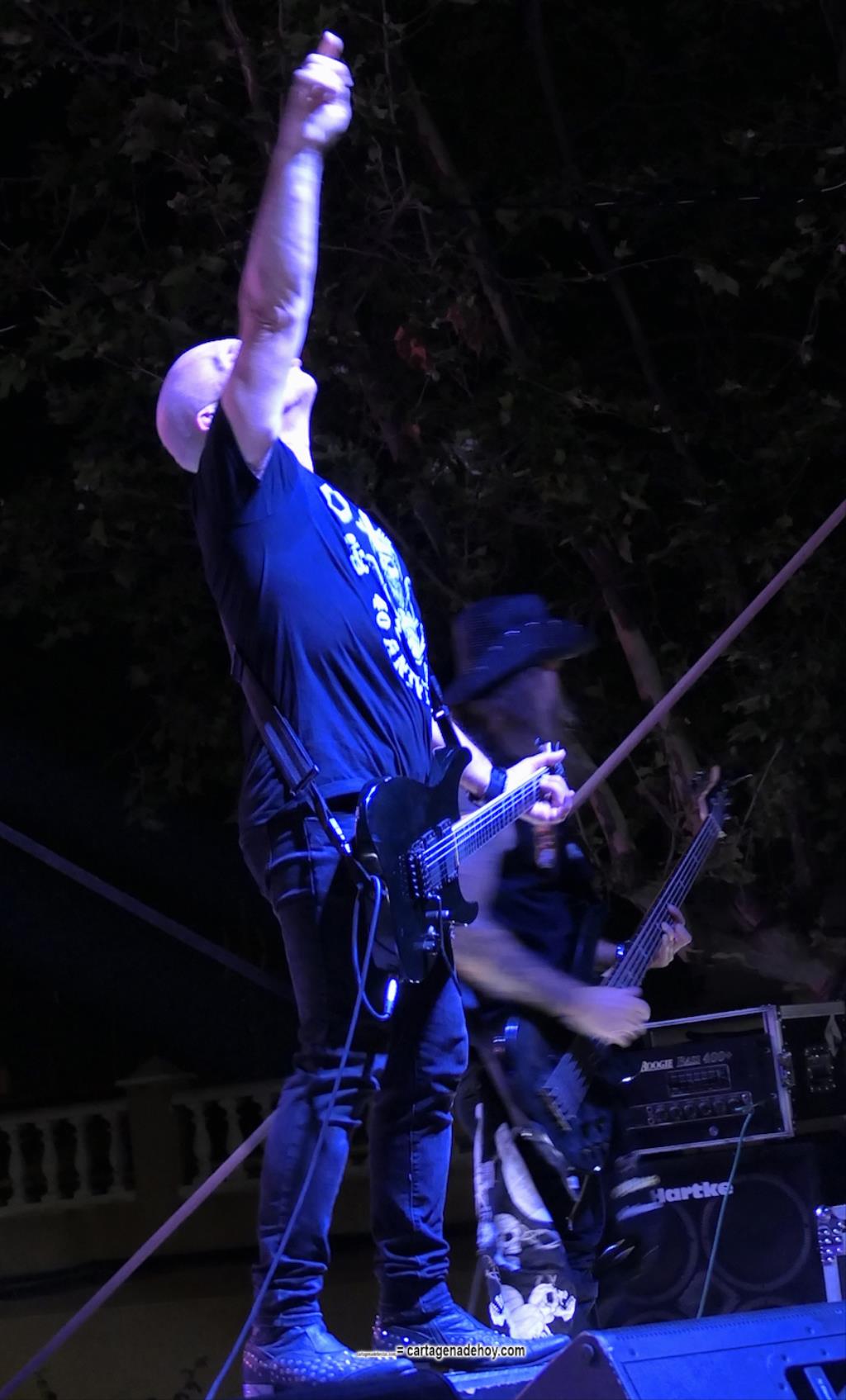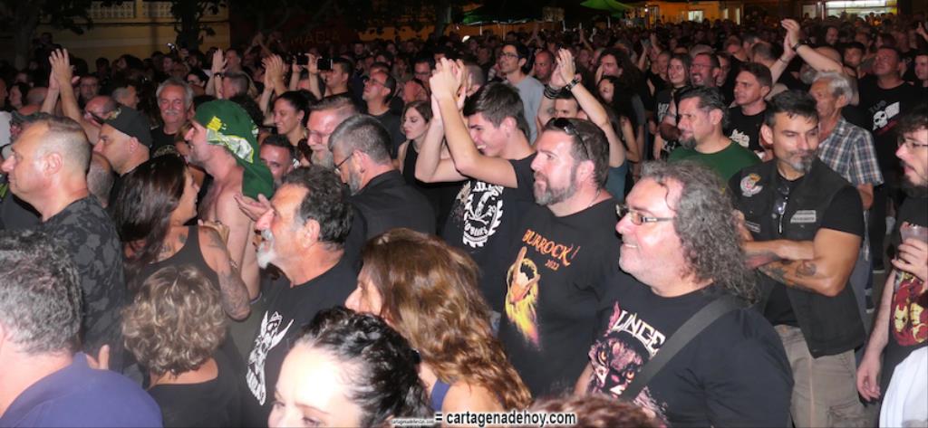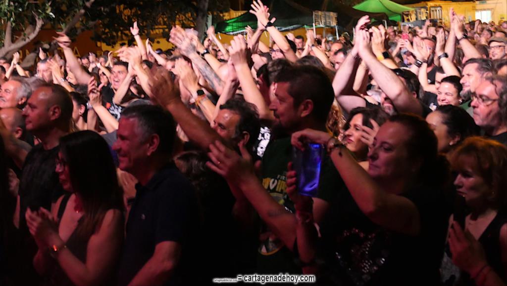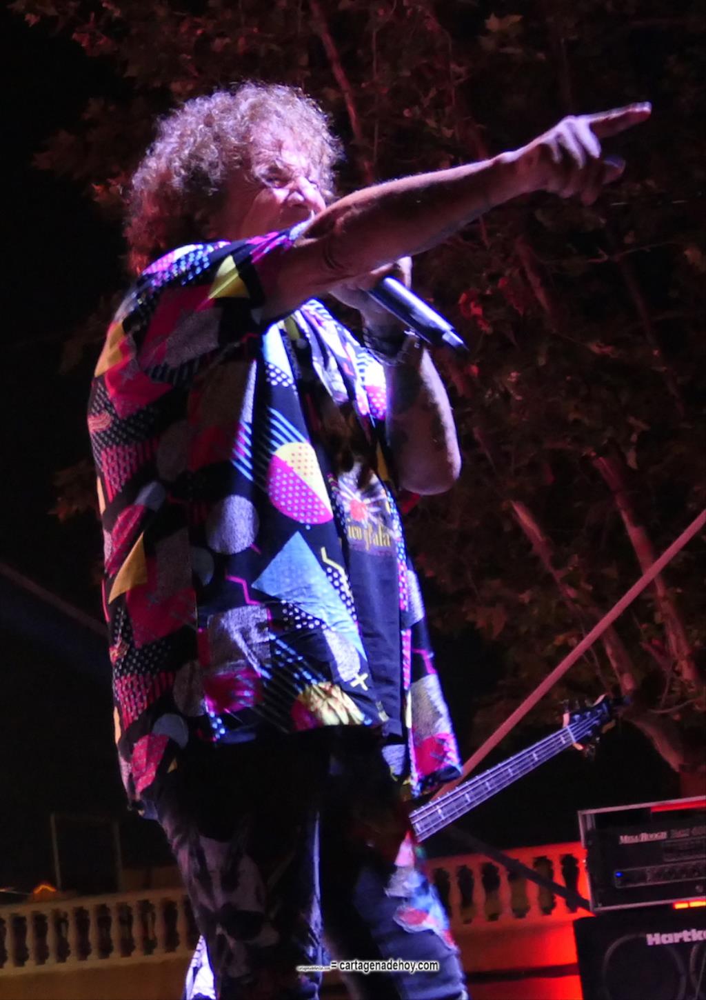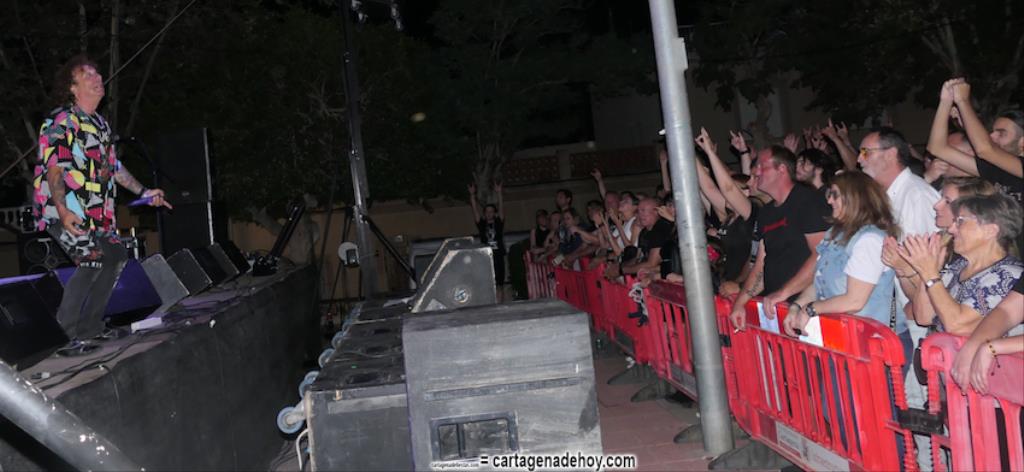 Vamos al capítulo musical, que comenzó sobre las diez y media de la noche y alcanzó las cuatro de una madrugada en la que, poco después, regresó la lluvia a Cartagena. Estupendas actuaciones de ‘Sin tregua’, ‘Sharabia’ y ‘Ángel Negro’, que también tienen a sus fieles conquistados merced a su buenhacer y calidad sonora, dentro de las variantes del rock que ofrecieron. Minutos antes de las dos de la madrugada apareció el cuarteto de ‘Obús’, siendo el último en subir al escenario un Fortu con camisa colorida, lo que contrastó en un ambiente donde la mayoría lucían las tradicionales camisetas negras. Comenzó con “Necesito más” y no faltó en su repertorio el súperconocido ‘Va a estallar el obús’ ni el ‘Dinero, dinero’ o el ‘Que te jodan’. Maestro sobre las tablas, fue puntal en mantener el júbilo entre el público. “¡¿Dónde estamos?!”, preguntaba a gritos. Unos decían que en Cartagena y otros que en Vista Alegre. Pues no… “¡Estamos en un concierto de rock…, arriba las manos!”.
