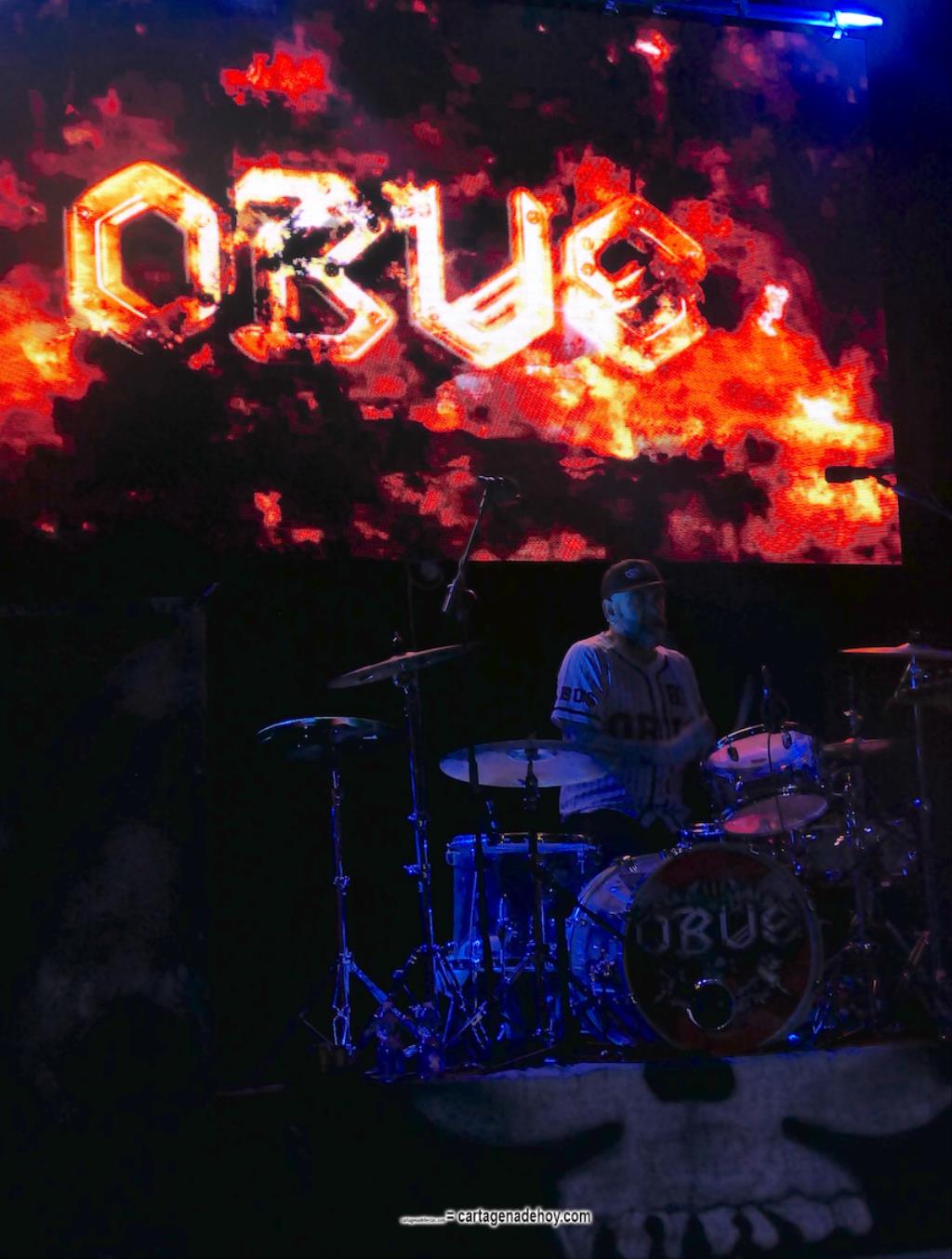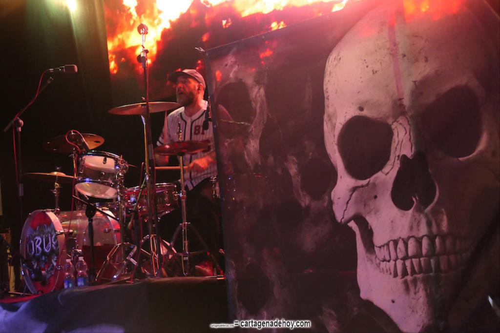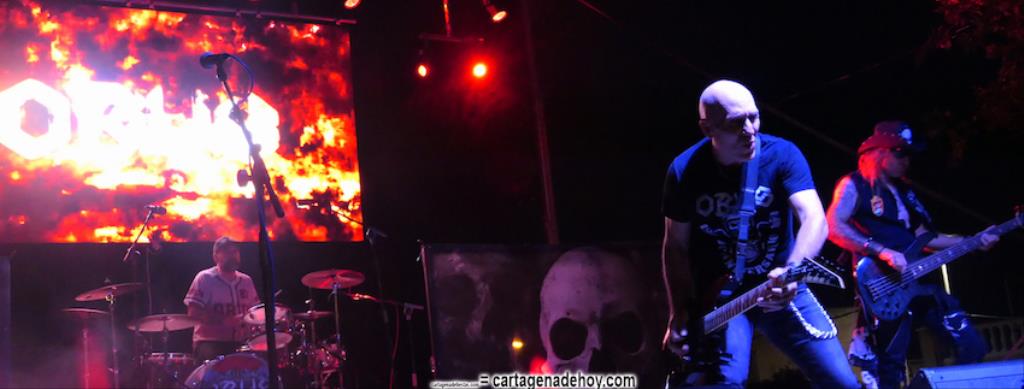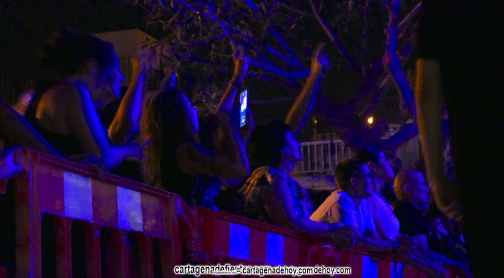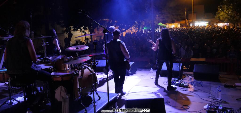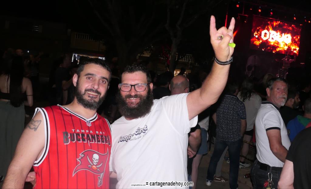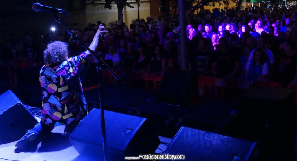 Vamos al capítulo musical, que comenzó sobre las diez y media de la noche y alcanzó las cuatro de una madrugada en la que, poco después, regresó la lluvia a Cartagena. Estupendas actuaciones de ‘Sin tregua’, ‘Sharabia’ y ‘Ángel Negro’, que también tienen a sus fieles conquistados merced a su buenhacer y calidad sonora, dentro de las variantes del rock que ofrecieron. Minutos antes de las dos de la madrugada apareció el cuarteto de ‘Obús’, siendo el último en subir al escenario un Fortu con camisa colorida, lo que contrastó en un ambiente donde la mayoría lucían las tradicionales camisetas negras. Comenzó con “Necesito más” y no faltó en su repertorio el súperconocido ‘Va a estallar el obús’ ni el ‘Dinero, dinero’ o el ‘Que te jodan’. Maestro sobre las tablas, fue puntal en mantener el júbilo entre el público. “¡¿Dónde estamos?!”, preguntaba a gritos. Unos decían que en Cartagena y otros que en Vista Alegre. Pues no… “¡Estamos en un concierto de rock…, arriba las manos!”.