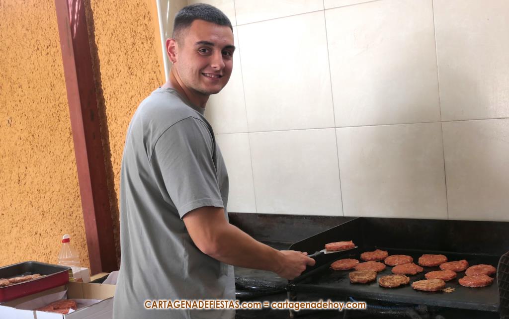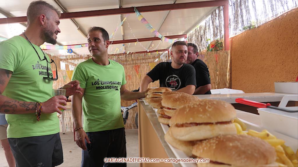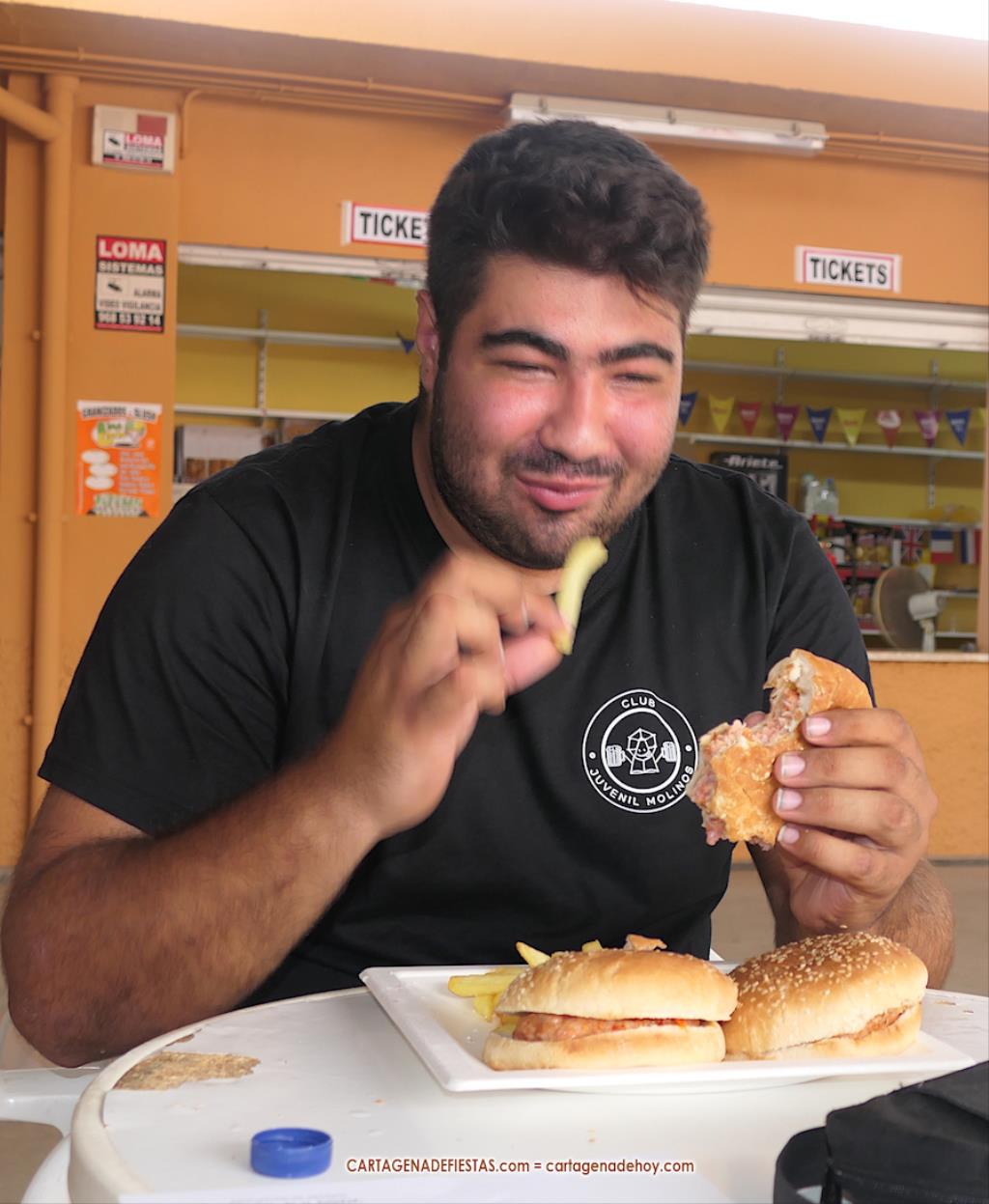 De pronto, comienza a sonar en el recinto festero la popular y motivadora música de 'Gonna Fly Now'. El motivo es que va a comenzar el concurso que premiará al que más hamburguesas coma en 10 minutos, novedad de las muy renovadas fiestas de Molinos Marfagones. Mientras suena el tema que compuso Bill Conti para la película 'Rocky', Salvador Madrid va a anunciando a los siete participantes, quienes se van sentando en mesas alineadas bajo la techumbre del área de cantina. A cada uno, la organización le proporciona una botella de dos litros de agua.