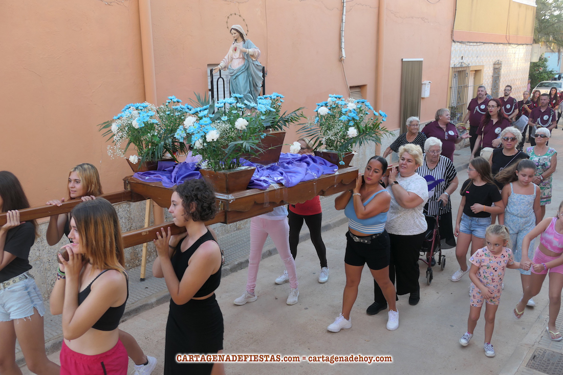 La imagen de María, que fue tallada hace más de un siglo y que fue donada por una familia, recorrió las calles del pequeño pueblo cartagenero en una tarde de fiestas que culminó con chocolatada. Hoy, guerra de tartas y un gran arroz para consumir de forma gratuita.