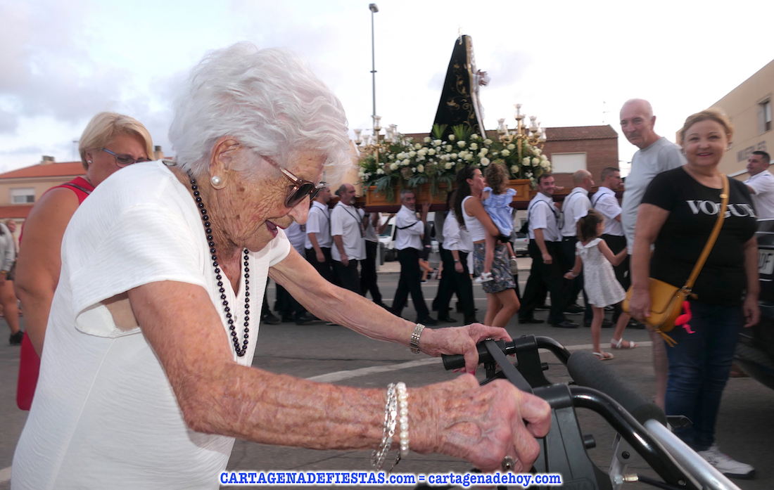 ¿Conocen ustedes a alguien con casi 104 años que salga en procesión por su propio pie? Para un servidor es algo inaudito, algo único. Es más, me he puesto a mirar en los buscadores de internet y no he encontrado nada. No digo que no exista, pero si lo hay tiene que ser tan excepcional como María Navarro Cervantes, conocida cariñosamente como 'Mariquita' y que el próximo día 29 de ete mes alcanzará esas 104 'primaveras'. Me generó una inmensa alegría cuando la vi el domingo, por innumerable ocasión, acompañar a la patrona de sus Molinos Marfagones, la Virgen de la Soledad. Impresionante. Hace unos años, antes de la pandemia, me decía que iba con bastón o muleta porque ya empezaban a fallarle las piernas. Ahora ha tenido que recurrir a una andadera, pero sigue siendo autónoma. Ya no está para vestirse de molinera, como hacía, pero sí para situarse al frente del grupo de promesas, junto a su Virgen más fiel. Es más, esta persona que ha superado dos pandemias (la 'gripe española' de 1919, cuando nació, y el coronavirus de 2020) no sólo es admirable en lo físico, sino también en lo mental, pues en la charla que tuvimos con ella nos habló de su devoción y de que las cuestas hacia arriba es lo que más duro se le hace, además de seguir aplicándose el secreto de su longevidad: "No parar". No me canso de elogiarla. Un encantador y cautivador caso único de persona.