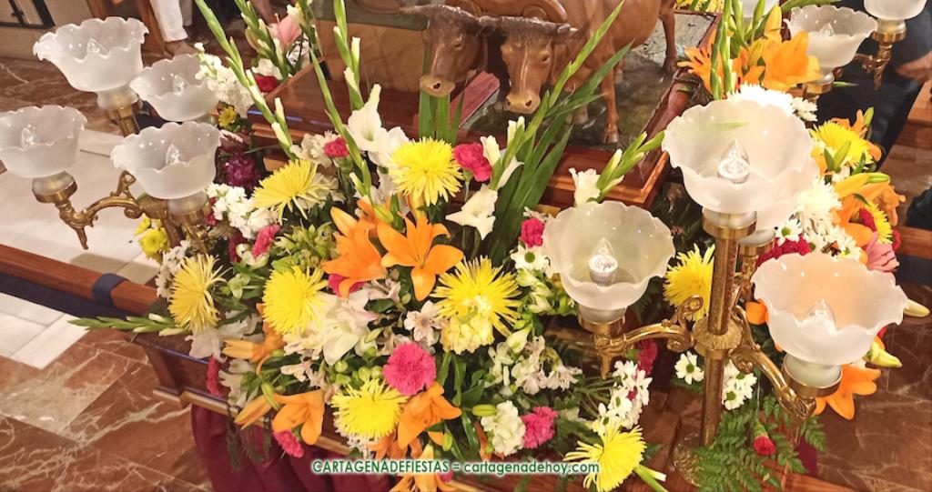 El patrón de Los Belones salió en procesión sobre una peana adornada por una preciosa, variada y colorida colina en la que se distribuyeron los ramos entregados por los vecinos en la ofrenda floral.