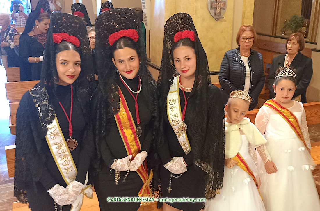 La comitiva contaba en su cabeza con las reinas y damas juveniles e infantiles de la corte de honor, llevando las más mayores vestuario de ‘manolas’ con sus bandas. El tradicional traje negro con peineta se prolongaba con otras seis vecinas, para después aparecer el trono llevado a tronos por cuatro fieles costaleros (con el cofrade Juan Salas como capataz), deseándose que aumenten los mismos para poder efectuar relevos en el recorrido y evitar un exceso de carga. Detrás, el sacerdote, los representantes de la comisión de fiestas y asociación de vecinos y la banda de música.