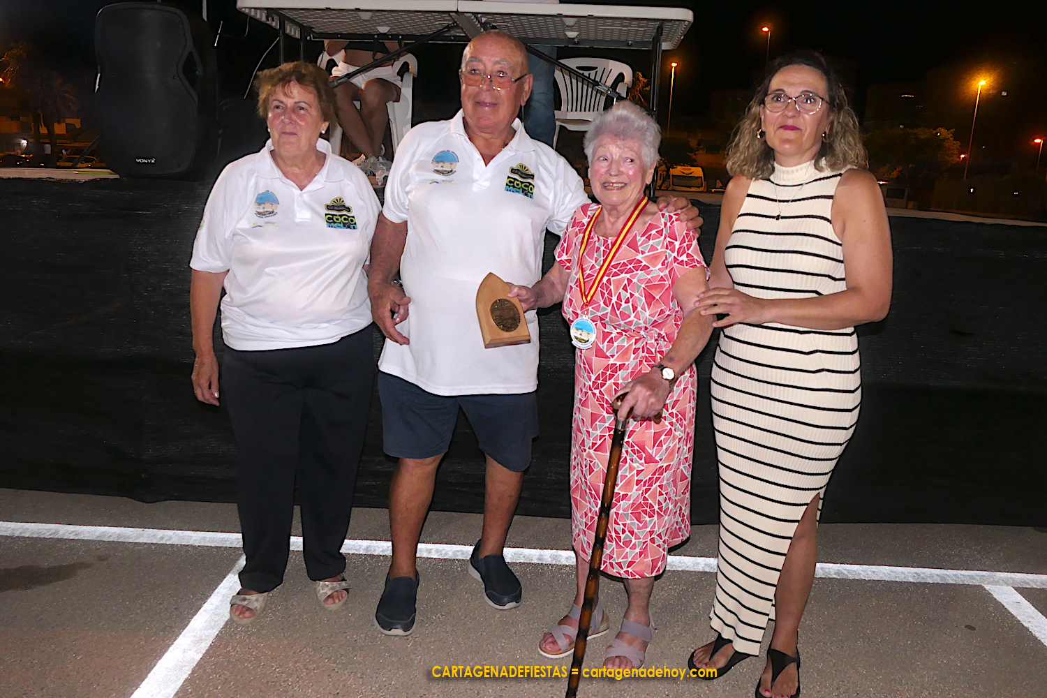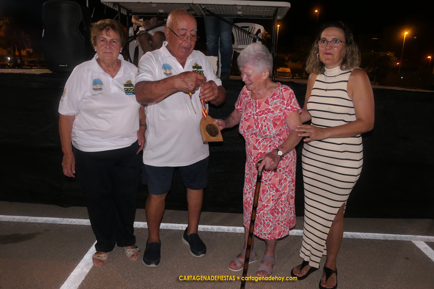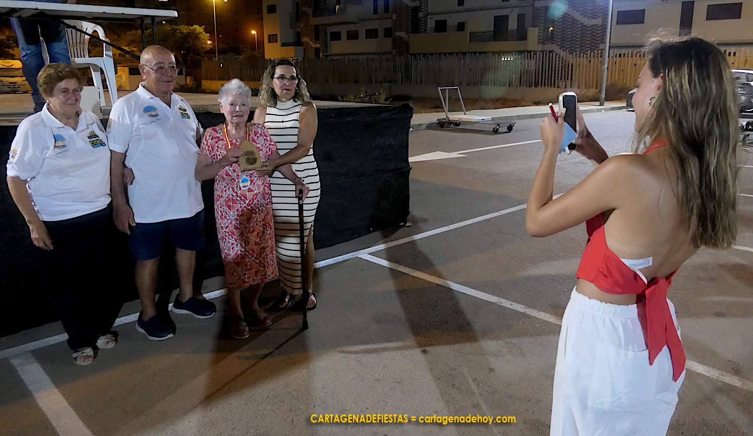 La asociación de vecinos de 'Las Salinas', a través de su presidente, José Antonio Martínez, entregó a Carmen los distintivos como merecedora de este nombramiento en el año 2024. Viuda de Juan Barrienzo, lleva residiendo en esta localidad marmenorense desde antes que, hace 21 años, se crease el colectivo vecinal.
