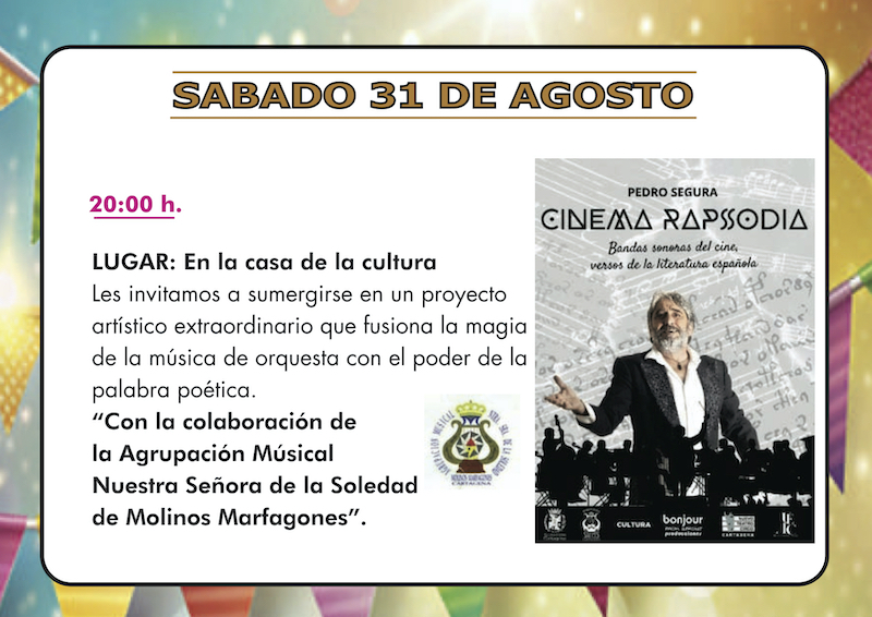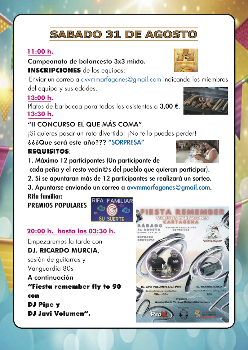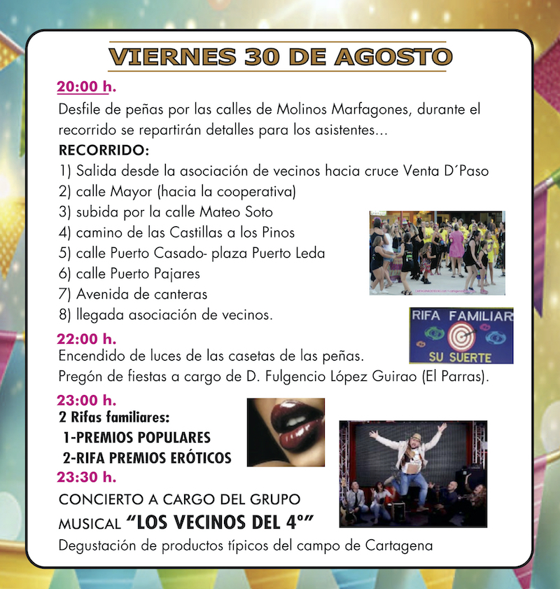Tras el desfile de las peñas, llegará a las 22 horas el encendido de las casetas y el pregón a cargo de Fulgencio López Guirao 'El Parras' en una velada que incluirá la actuación de 'Los vecinos del cuarto'. El sábado llega la segunda edición del concurso de 'comilones' más 'Cinema Rapssodia' con Pedro Segura y una 'Fiesta remember', mientras que el domingo es para la fiesta rociera y los concursos de karaoke y de lanzamiento de melones molineros. El programa festero llegará hasta el 8 de septiembre.