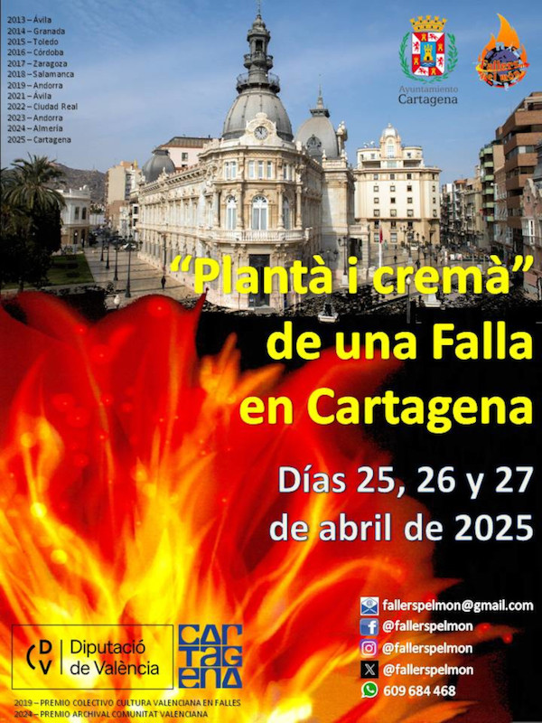 Medio millar de falleros visitarán Cartagena gracias al impulso del Ayuntamiento, la Diputación de Valencia y Fallers pel món. Esta asociación organiza cada año esta fiesta popular valenciana en un lugar distinto, siendo Cartagena la ciudad elegida este 2025. En el puerto, junto a Héroes de Cavite, se instalará un recinto ferial y carpa, con acceso libre para todos los habitantes de Cartagena (será necesario presentar DNI)