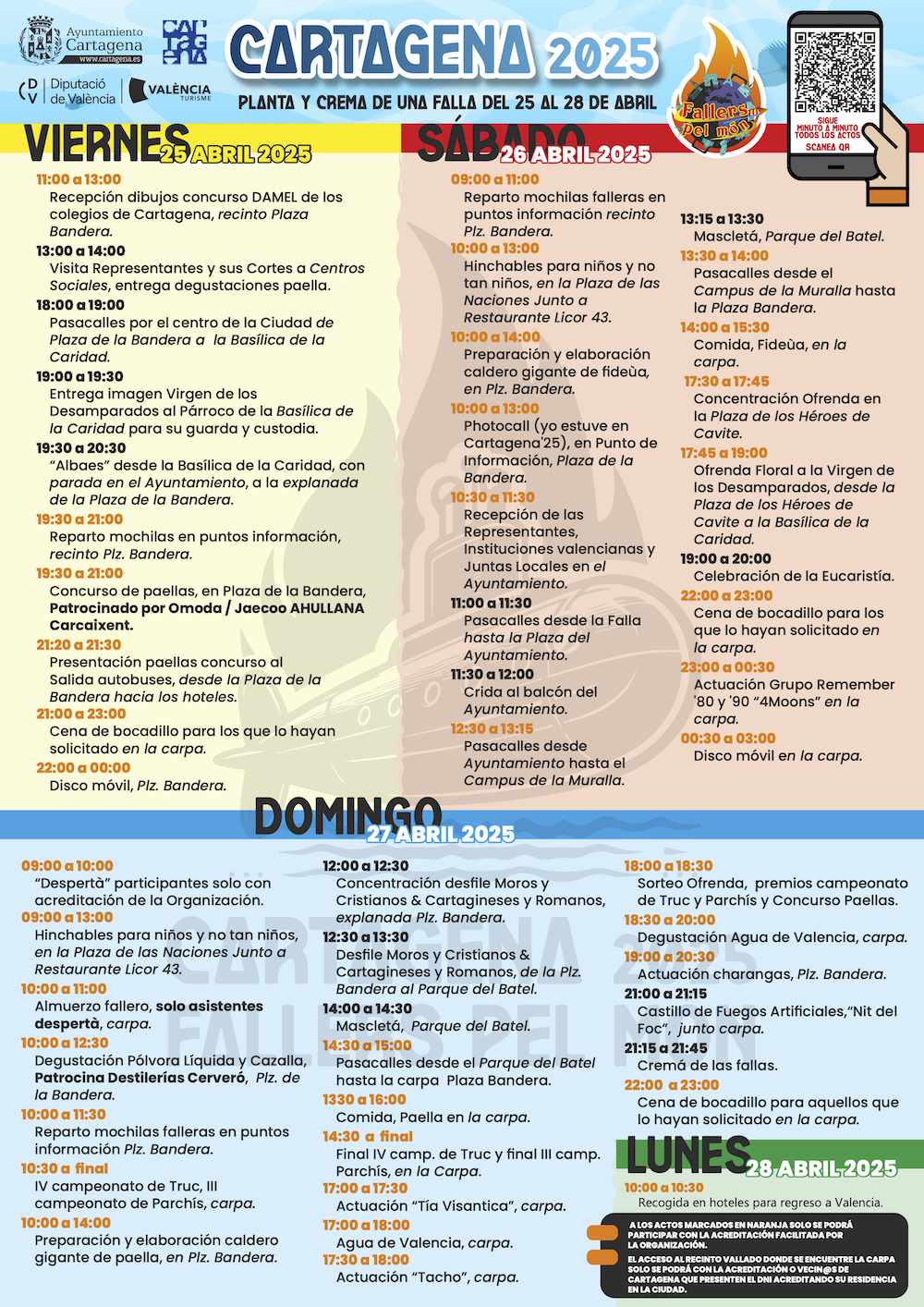 La programación al completo de estas Fallas que se celebran en Cartagena del 25 al 27 de abril puede consultarse online adjunta a la noticia o en la página web https://turismo.cartagena.es/