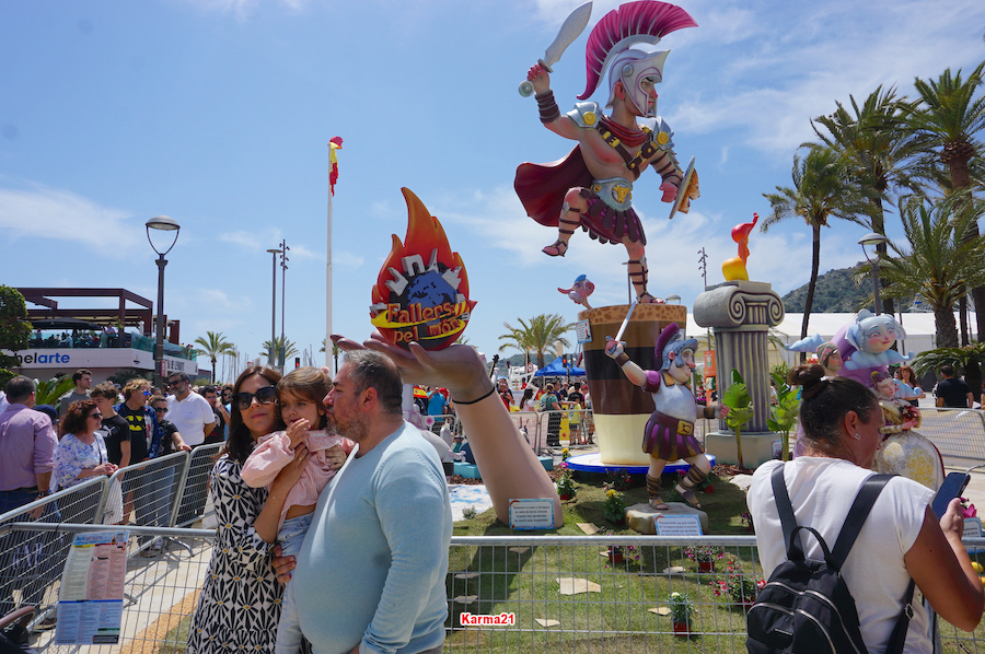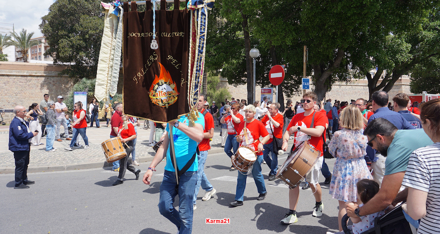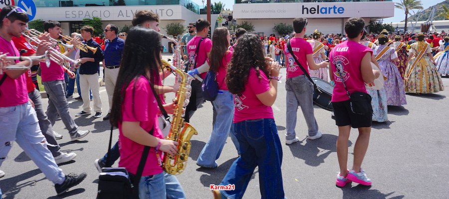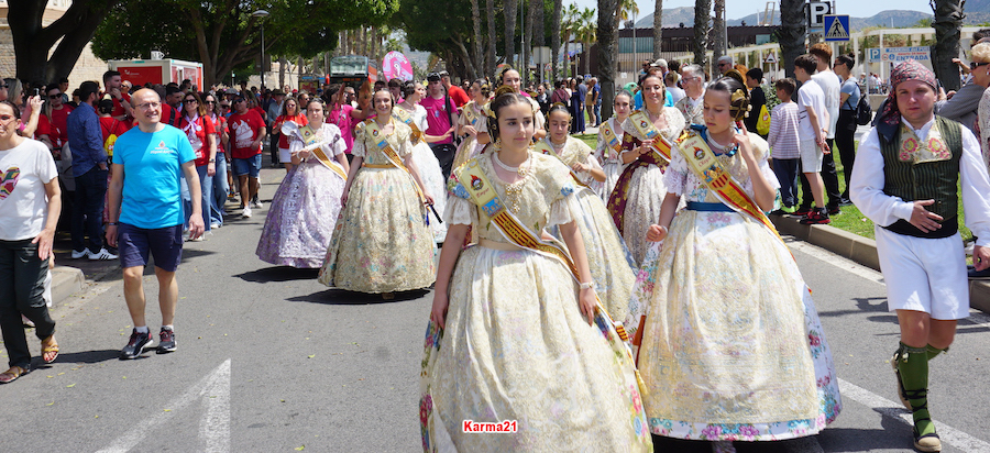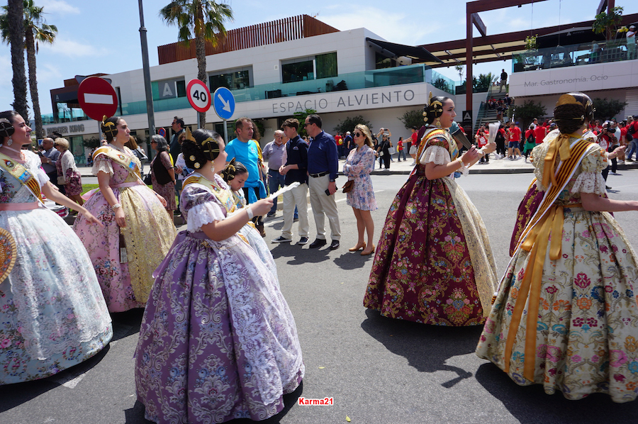 En una mañana soleada y calurosa, el programa de actos ha incluido la crida o pregón desde el balcón del Palacio Consistorial y una mascletá con 100 kilos de pólvora (tiene un artículo propio en este diario) a las 13.15 horas (ha empezado casi puntual) en la pradera de El Batel, para después llevarse a cabo un sonoro pasacalles valencianos, con falleras enriqueciendo la formación, hacia la explanada del puerto, donde estaba la carpa del epicentro gastronómico del día.