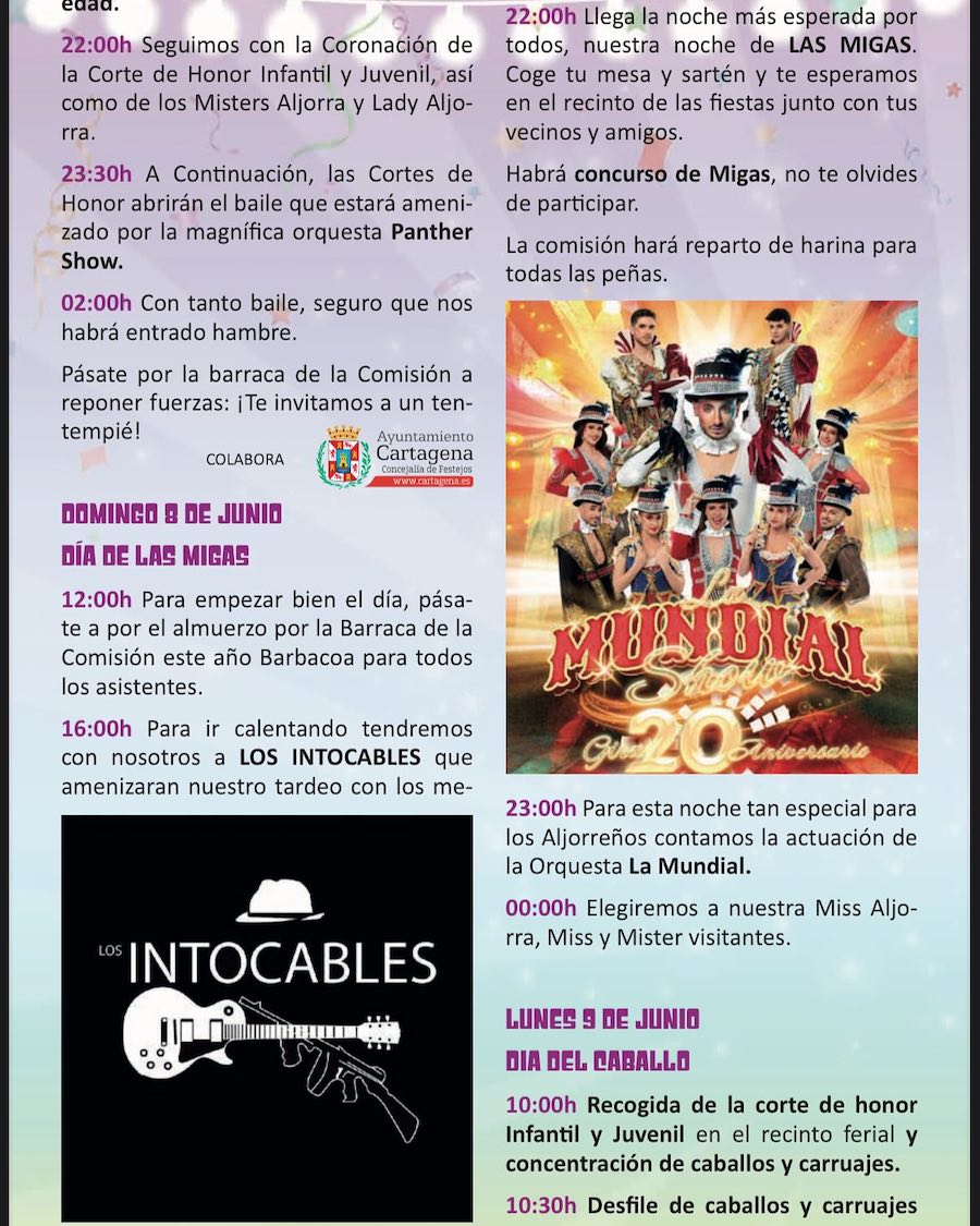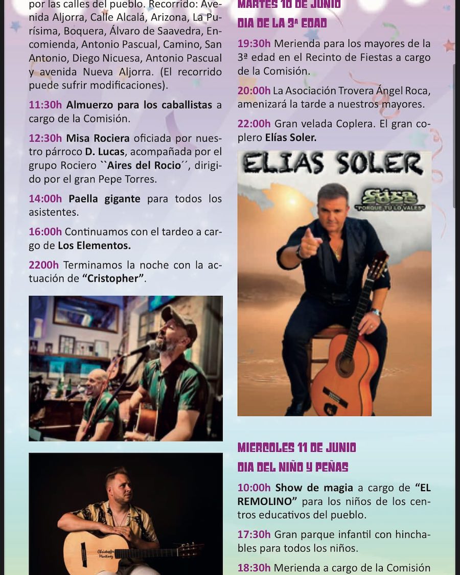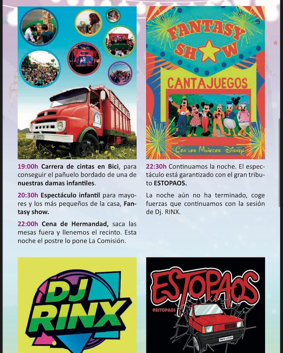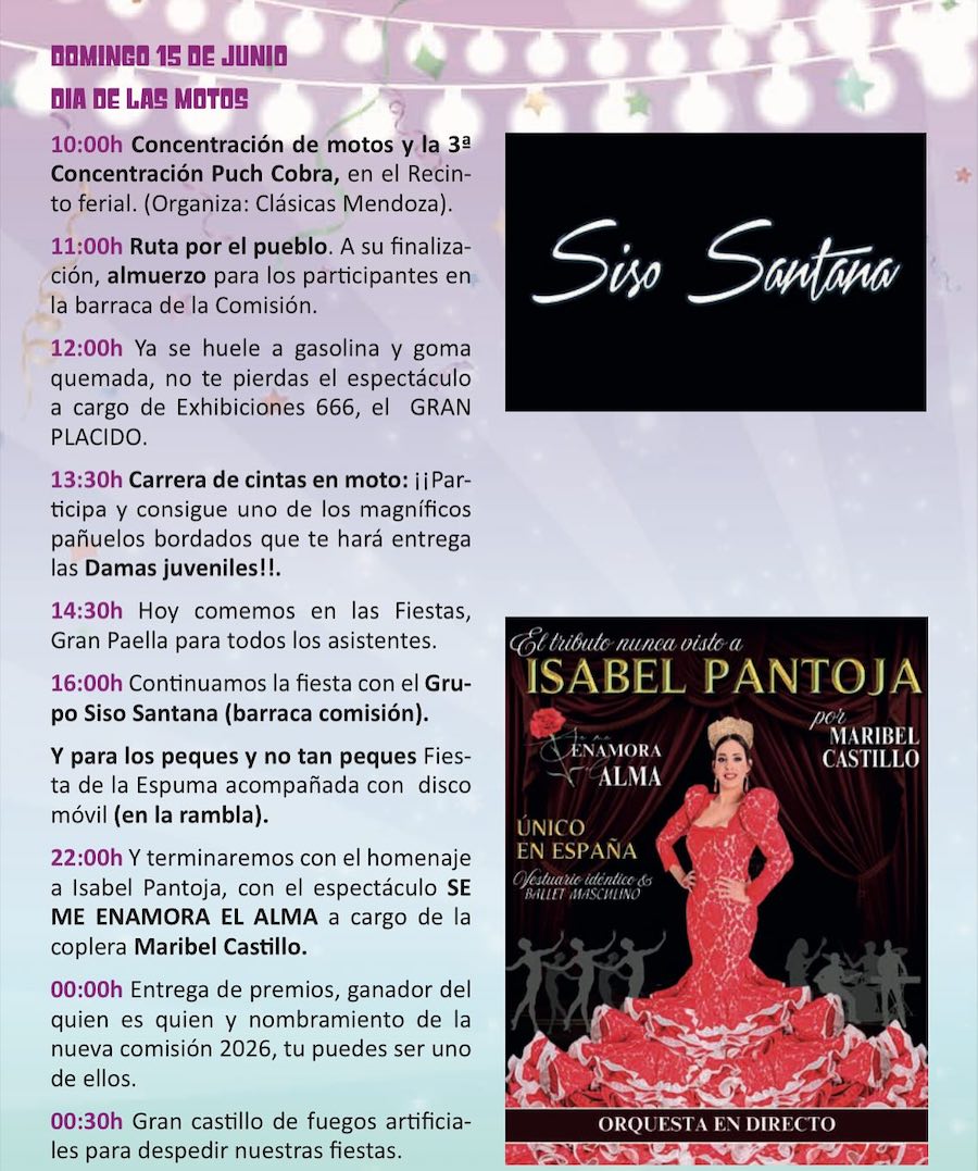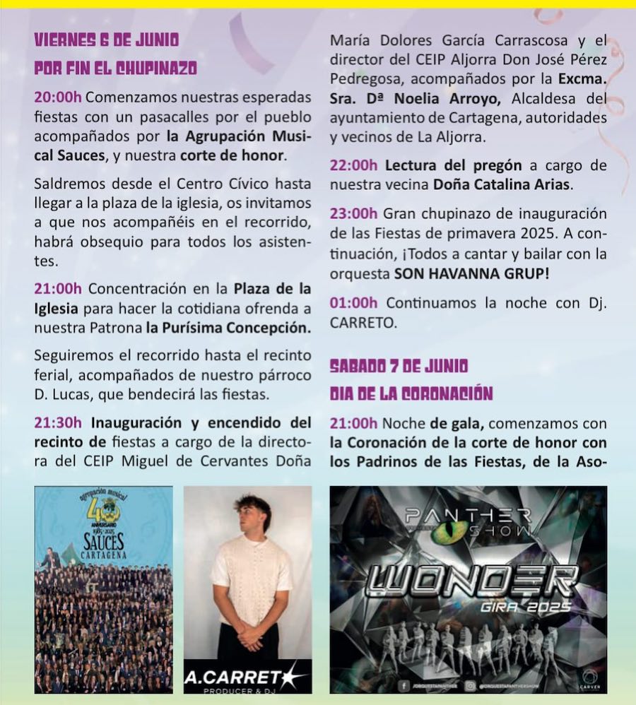 Los festejos de primavera comienzan hoy con un pasacalles con la corte de honor y la música de Sauces, la ofrenda a la patrona, el encendido del recinto festero y el pregó de Catalina Arias, para después tener lugar el esperado chupinazo y las actuaciones de 'Son Havanna Grup' y el dj Carreto. La coronación de la corte del honor será el sábado, con protagonismo musical para 'Panther Show', mientras que el domingo habrá tardeo con 'Los intocables' y noche de migas amenizada por 'La Mundial Show'. El lunes es el 'día del caballo' y del arroz gigante.