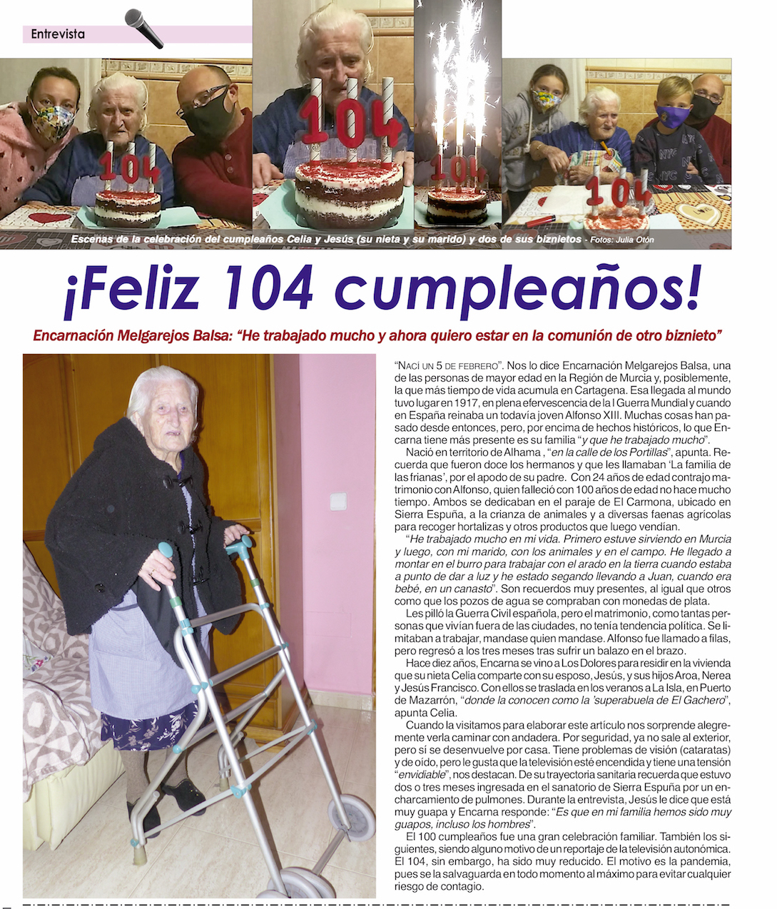 Ofrecemos el reportaje que la desaparecida revista 'El Puente' dedicó a Encarnación Melgarejo cuando cumplió los 104 años de edad.