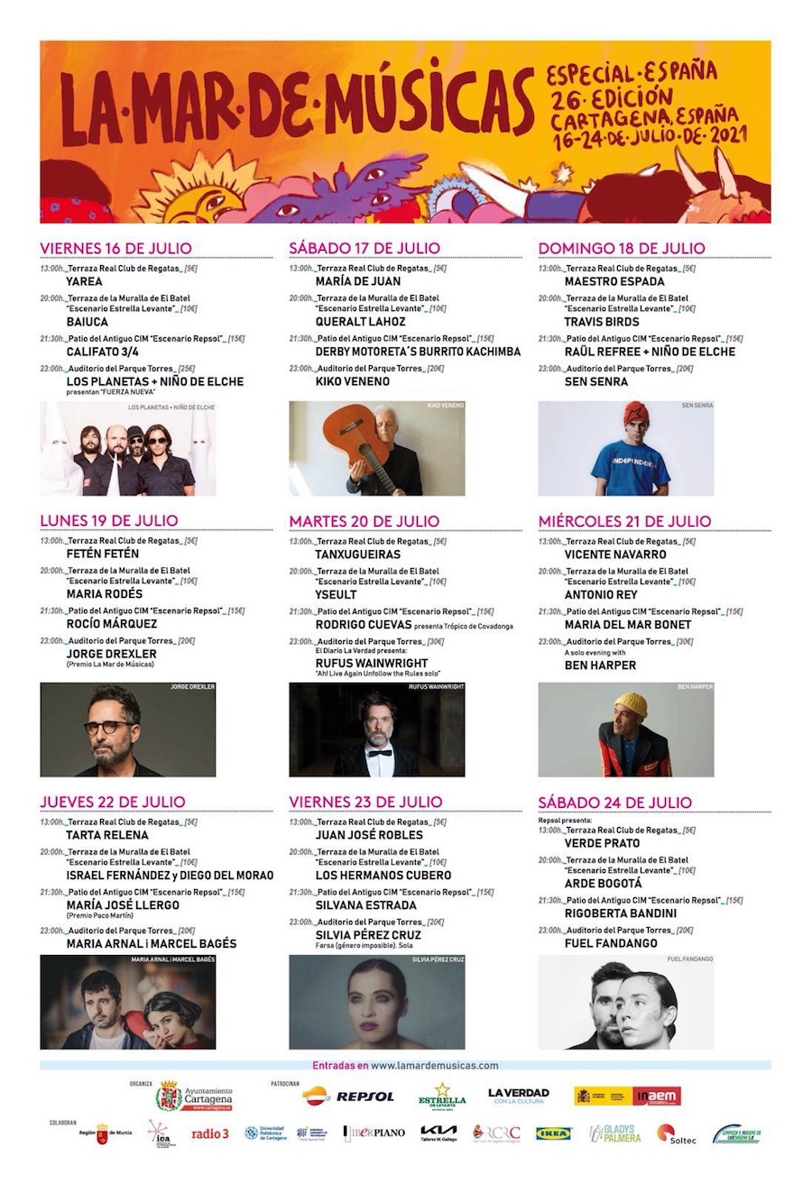 En la 26 edición del festival de Cartagena se podrá escuchar la folktrónica gallega de Baiuca, la electrónica combinada con músicas de la tradición popular andaluza de Califato 3/4, la reinvención de iconos musicales con tintes de rock, flamenco y música popular con Los Planetas y Niño de Elche, presentando Fuerza Nueva, la fusión de flamenco y rap de la catalana Queralt Lahoz, el coctel macarra de rock andaluz y psicodelia de los Derby Motoreta´s Burrito Kachimba. Y a esa figura imprescindible de la música española, siempre en evolución, como es Kiko Veneno.
