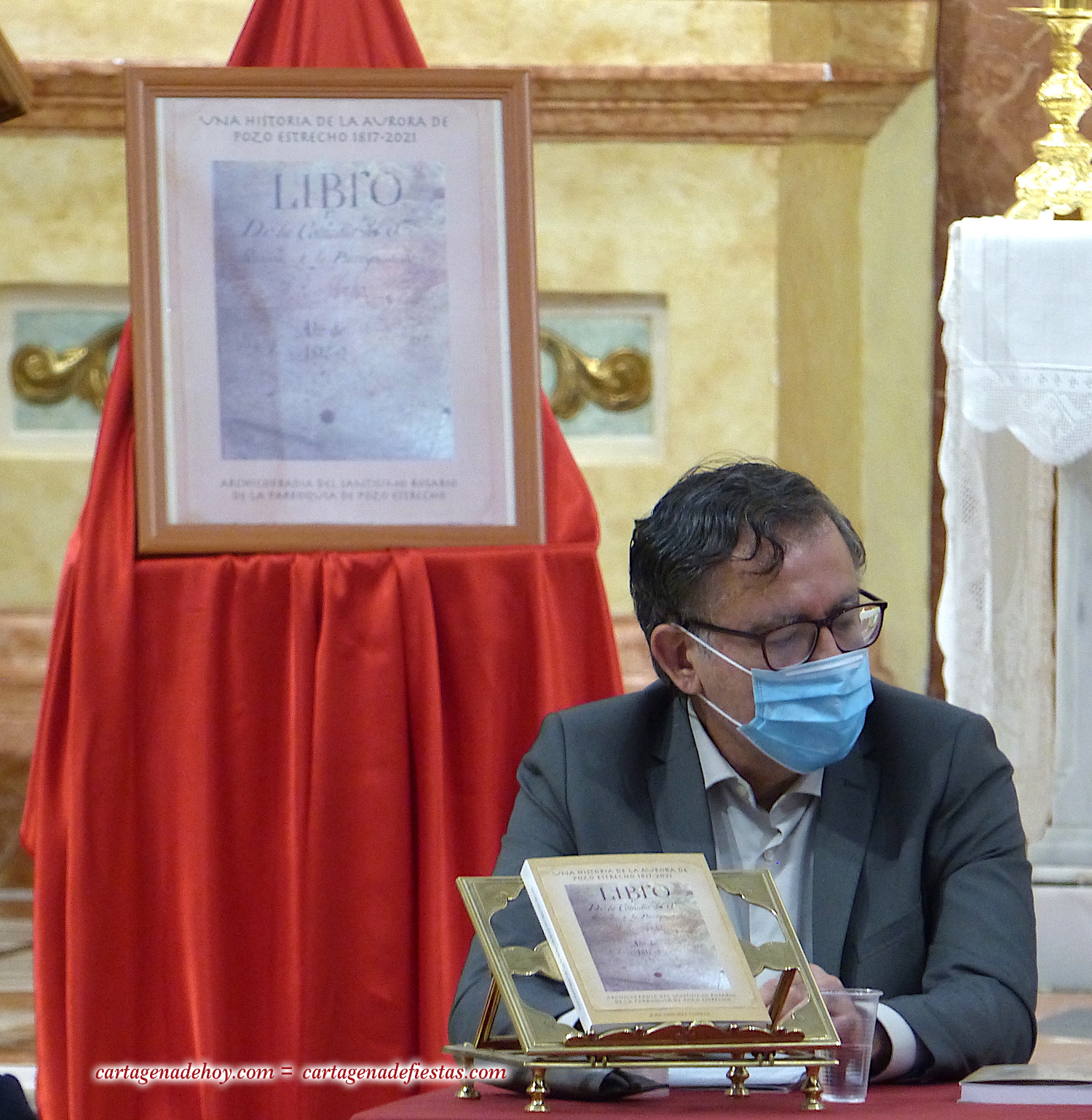 La presentación del acto correspondió a Daniel Segura Saura, del coro de La Aurora, quien además de recordar que la Archicofradía del Santísimo Rosario surgió en la iglesia donde se encontraban, explicó que la idea del libro surgió hace más de dos años a raíz de un documento eclesiástico de 1904 (libro de cuentas de la parroquia) donde figura la archicofradía. "A partir de ahí se profundizó en sus orígenes", remarcando que la carencia de más documentación escrita ("es muy pobre") ha impedido conocer más, pero que se ha conseguido ir a sus orígenes a principios del siglo XIX. "La archicofradía se rescata ahora del olvido para enriquecer el patrimonio de Pozo Estrecho a través de sus usos, costumbres y tradiciones", poniendo énfasis en que en esta jornada confluían La Aurora (con 204 años de historia), SAM Santa Cecilia (con 130) y la iglesia (con 322).