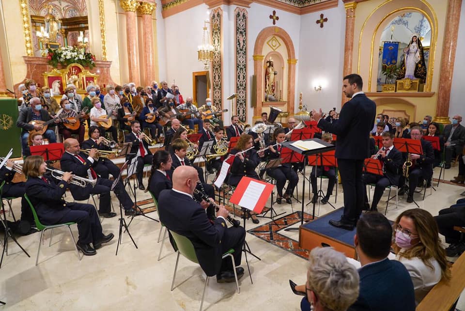 La presentación del libro 'Una historia de la Aurora de Pozo Estrecho (1817-2021)', de José Sánchez Conesa, y el descubrimiento de una placa en un monolito dedicado a la Archicofradía de Nuestra Señora del Rosario, fundada en 1817, sirve para que los auroros se unan por vez primera a la Sociedad Artístico Musical Santa Cecilia (con 130 años de andadura) para interpretar la pieza musical más antigua de la Región de Murcia en un acto que acogió la parroquia de San Fulgencio (surgida hace 322 años).