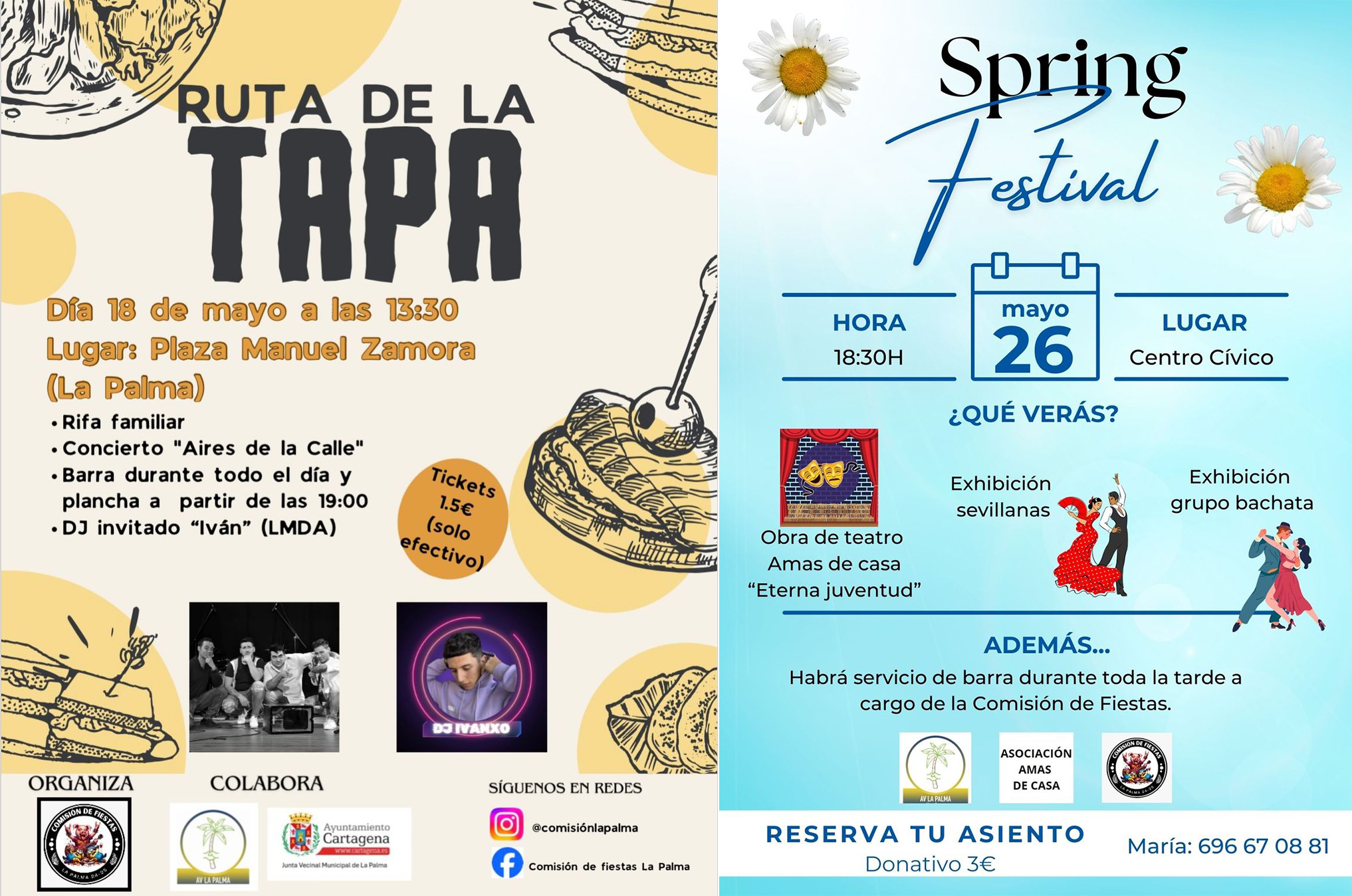 La plaza Manuel Zamora acoge este sábado una ‘Ruta de la tapa’ que enriquecerá la música de ‘Aires de la calle’ y DJ Iván. Para la tarde del domingo de la semana siguiente se fija el evento ‘Spring Festival’, que, en el centro cívico, ofrecerá obra de teatro y exhibiciones de sevillanas y bachata.