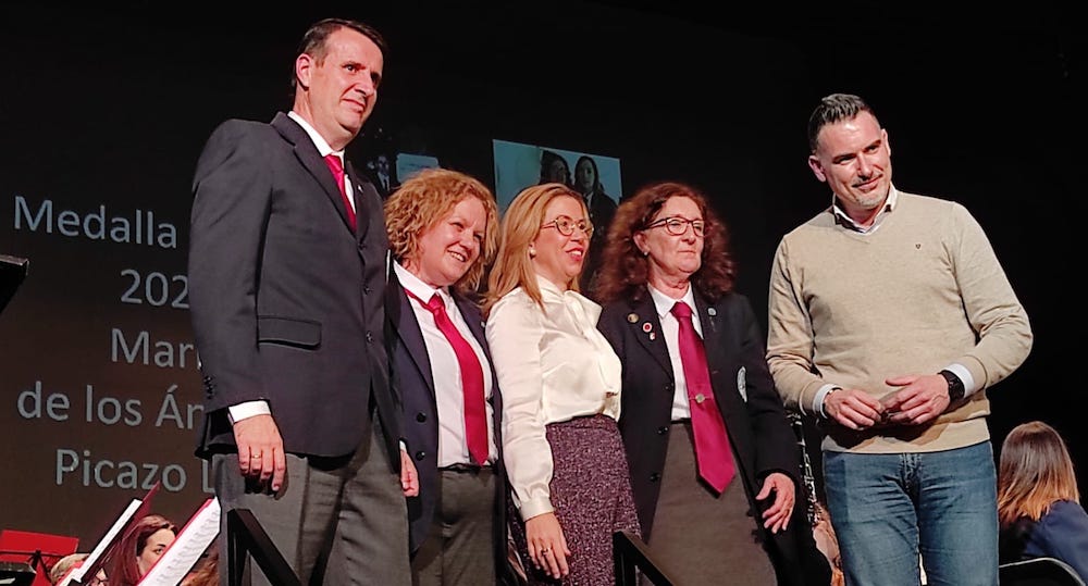 También fue tarde para darle la bienvenida a los ocho nuevos músicos que se han incorporado a la banda titular y para entregar distinciones, entre las que destaca la recibida por María Ángeles Picazo Leal, quien forma la banda desde hace 22 años y es madre del compositor, director y músico José Alberto Pina Picazo, antiguo componente de Sauces que se ha labrado un brillante palmarés como compositor y que también estuvo entre los distinguidos en el Teatro Circo.
