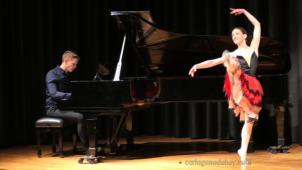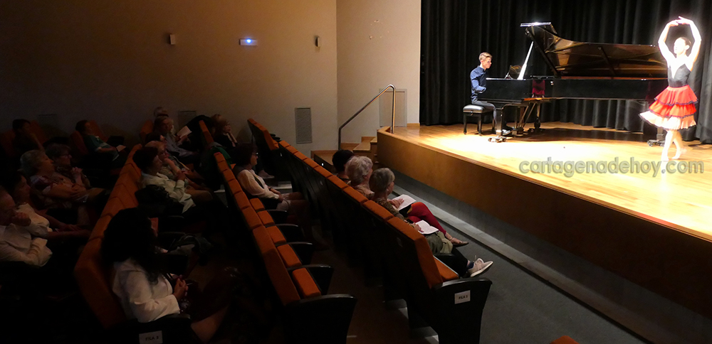 El espectáculo sobre el escenario del aula de cultura 'Antonio Ramos Carratalá' de la calle Mayor de Cartagena fue ofrecido por José Vicente Riquelme Ros, en el piano, y lena Molina Llopis, con la danza, dentro de una actuación encuadrada en un concierto de música clásica espñaola en homenaje al bailarín Félix García.