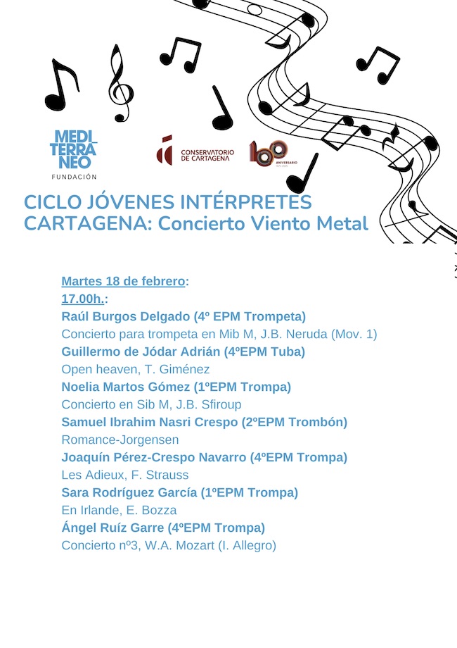 El ciclo organizado por el Conservatorio de Música de Cartagena en la sede de la calle Mayor de la Fundación Mediterráneo se inicia hoy con viento-metal y tendrá las siguientes citas el miércoles 26 y os días 4, 25 y 26 de marzo. Entrada gratuita.