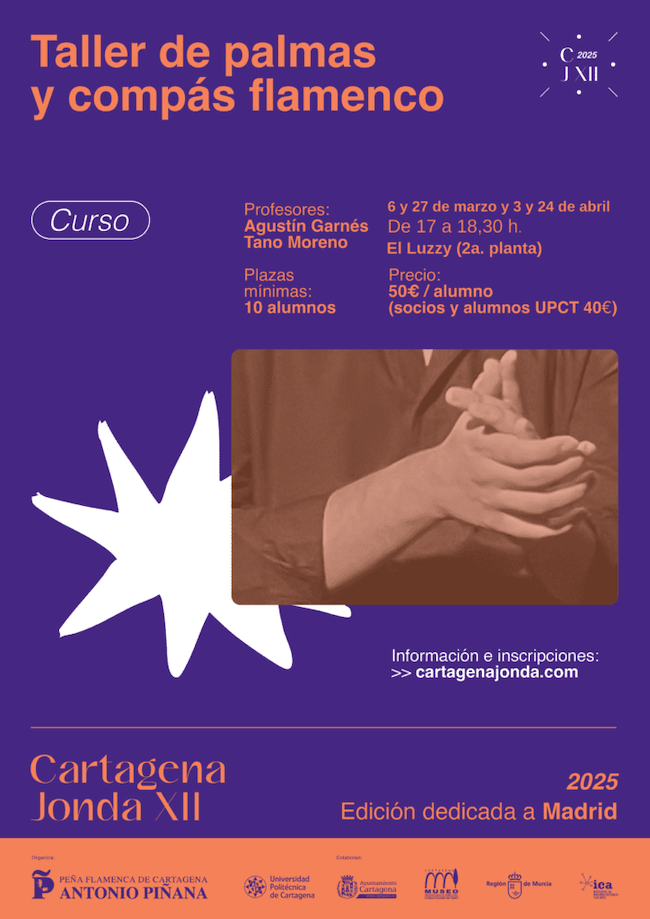 Organizado por la peña 'Antonio Piñana' de Cartagena para aprender a llevar el compás con fuerza y estilo, será impartido por los profesores Agustín Garnés y Tano Moreno los días 6 y 27 de marzo y 3 y 24 de abril de 17 a 18.30 horas en El Luzzy.