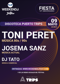 La organización del festival de 'pinchadiscos' que tendrá lugar el 21 de junio organiza una fiesta previa para el 9 de mayo en Discoteca Puerto Trips para celebrar su décimo aniversario. Estarán Toni Peret (foto adjunta), Josema Sanz y DJ Tato.