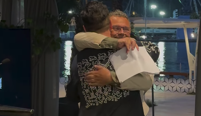 Tras la presentación, se ofreció un ágape a los asistentes, siendo el epílogo las actuaciones en la discoteca de Toni Peret (en la foto fundiénse en un abrazo con Juan Pedro Hurtado), con un show audiovisual de la música ochentera y noventena, además de Josema Sanz y DJ Tato.