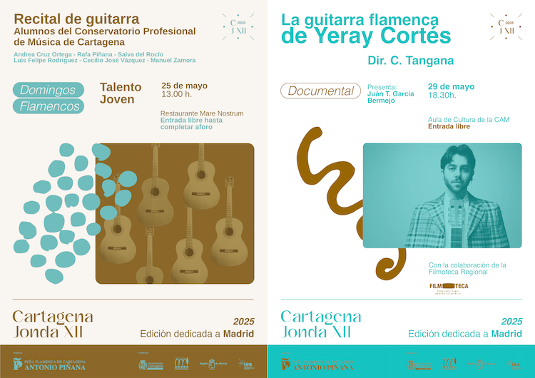 La peña flamenca 'Antonio Piñana' de Cartagena anuncia la celebración en mayo de un domingo flamenco con alumnos del Conservatorio de Música en el restaurante Mare Nostrum (día 25) y de la proyección de la película 'La guitarra de Yeray Cortés' en el aula de la Fundación de la CAM (día 29). La entrada es gratuita en ambos eventos.