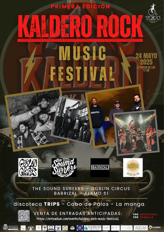 La Manga y Cabo de Palos celebran un festival de rock el 24 de mayo con música, arte urbano y mercadillo artesanal con ropa surfera desde las seis de la tarde. El cartel del 'Kaldero Rock', que tiene lugar en discoteca Trips y cuenta con el impulso del Ayuntamiento de Cartagena y el Consorcio de La Manga, lo integran grupos emergentes; como los locales The Sound Surfers, Barrizal, Goblin Circus y Álamo 51. Durante la actuación de las bandas, La Compañía de Mario, creará un mural en grafiti. Las entradas están a la venta desde 10 euros en la web Entradium.La asociación local sin ánimo de lucro The Sound Surfers organiza este evento en las inStalaciones cedidas por la discoteca Trips con el apoyo también de empresas locales. Fruto de esta colaboración habrá regalos y sorteos entre el público: noches de hotel, bautismos de buceos, clases de surf, o comidas en restaurantes. Entre los establecimientos colaboradores se encuentros Hotel Entremares, los centros de buceo Planeta Azul e Islas Hormigas, SUB UP Hostel, La Manga Surf School y los restaurantes Gran Torinio, Miramar y CP8.