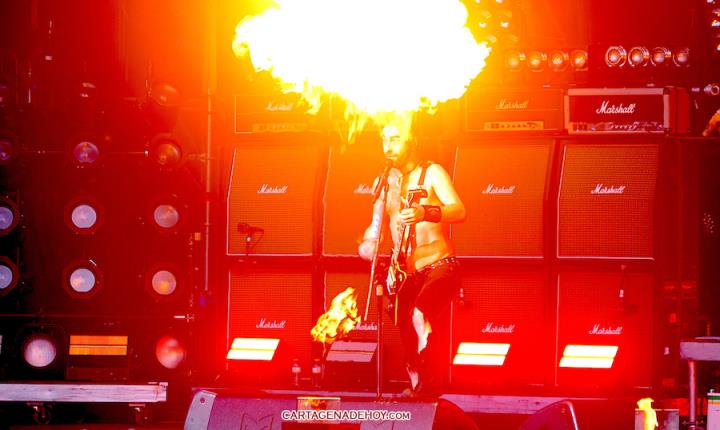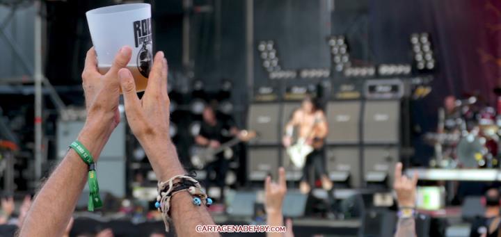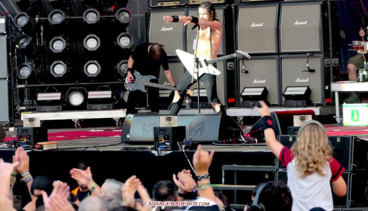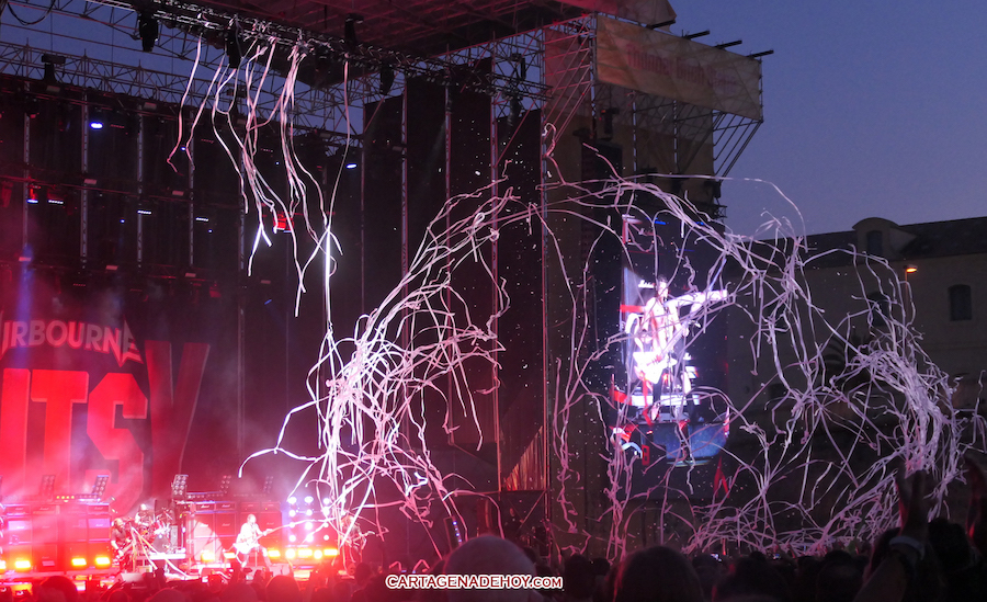 Ayer, en la pradera del Batel de Cartagena, se entregó a tope, como bien reflejaba el sudor que brotaba por sus poros y enseguida consiguió una complicidad muy grande con el público, entre el que avanzó sobre los hombros de otra persona. También se le vio preparar güisquis con hielo sobre un altavoz, los cuales repartió después entre sus compañeros. Su generosidad líquida se amplió después lanzando vasos de plástico con cerveza muy bien dirigidos a los espectadores. A todo ello hay que unir sus saltos mientras tocaba la guitarra o acciones como coger un foco y ponerse a iluminar a espectadores. Todo un espectáculo, como bien debe ser un concierto de rock. Otro detalle fue que cuando los músicos abandonaron el escenario, antes de los 'bises', salió Ryan para llamarlos con una bocina. El broche fue la lluvia de tiras de papeles cayendo sobre los espectadores.