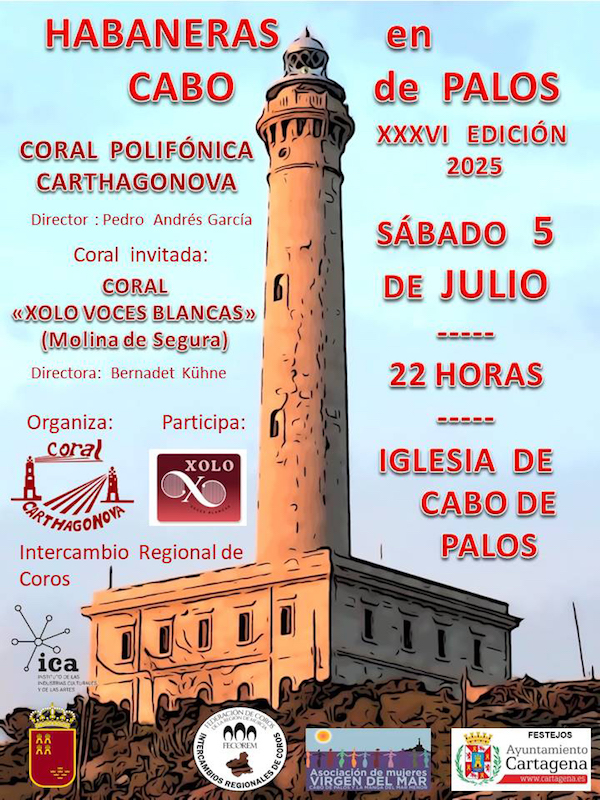 La Coral Polifónica Carthagonova, con la colaboración del Ayuntamiento, celebra este sábado 5 de julio la XXXVI edición del concierto de habaneras. El evento arrancará a las 22:00 horas en la iglesia de Cabo de Palos, con entrada libre, hasta completar aforo.