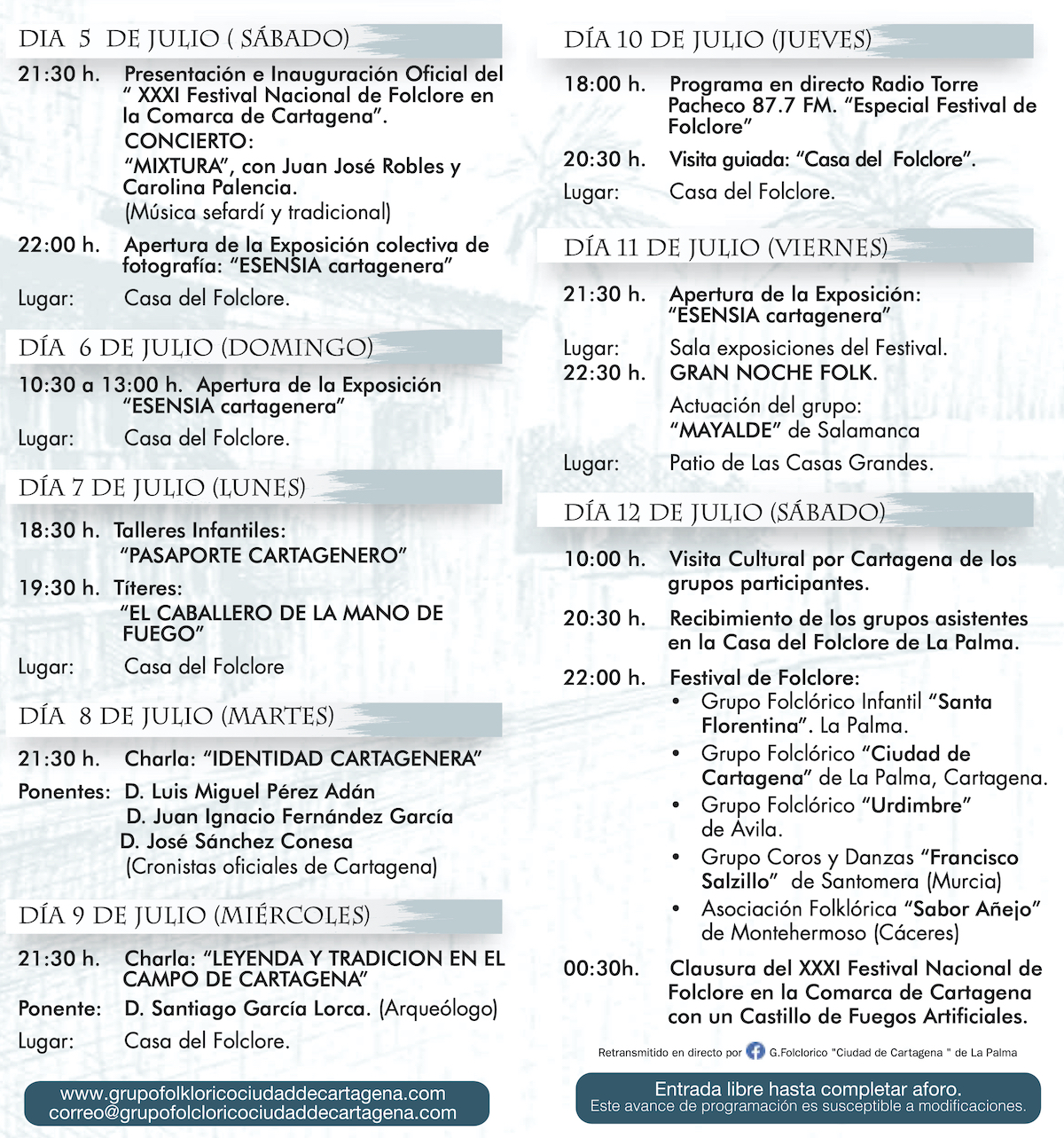 El XXXI Festival Nacional de Folclore de la Comarca de Cartagena, organizado por el Grupo Folclórico Ciudad de Cartagena con la colaboración del Ayuntamiento, arranca este sábado, 5 de julio. La Casa del Folclore de La Palma acogerá, a las 21:00 horas, la inauguración del evento, que contará con un concierto y la apertura al público de una exposición fotográfica. La programación completa, que se desarrollará hasta el 12 de julio e incluye el festival de folclore, diferentes charlas, actividades infantiles, talleres o una noche folk con entrada libre, está disponible adjunta a esta noticia, así como en el apartado Agenda Ciudad de la web municipal www.cartagena.es.La música sefardí y tradicional de Mixtura, con Juan José Robles y Carolina Palencia, estará presente este sábado en la inauguración del certamen, a las 21:30 horas desde la Casa del Folclore. Después, a las 22:00 horas, los interesados podrán conocer la exposición fotográfica colectiva ESENSIA de Cartagena, en la que participan fotógrafos del municipio como Juan Manuel Díaz Burgos. La muestra también se podrá visitar el domingo 6, de 10:30 a 13:00 horas; así como el viernes 11 de julio, a las 21:30 horas.