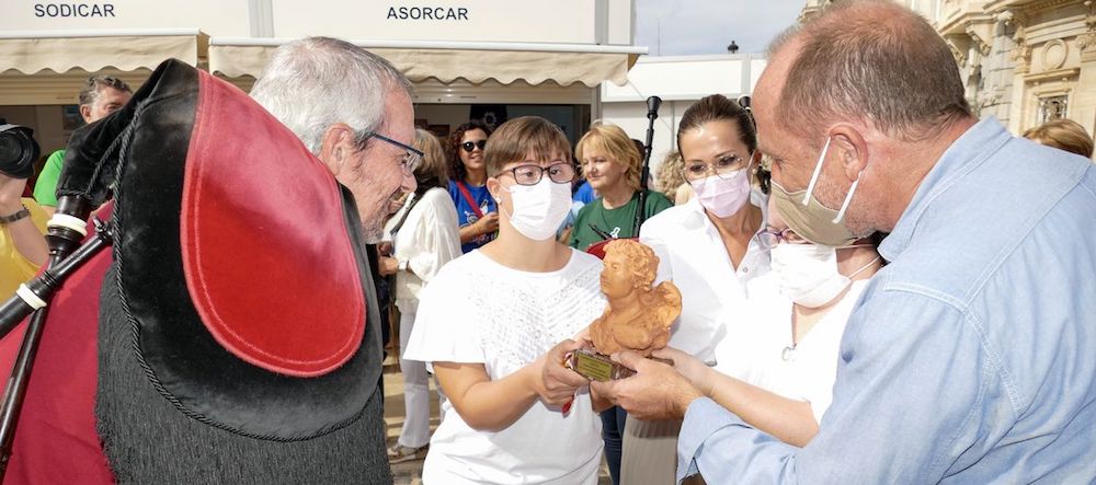 La banda cartagenera de gaitas y percusión, que ha amenizado hoy la inauguración de la feria 'Inclusiones', ha recibido una obra donada por el escultor Juan José Quirós, en reconocimiento a su colaboración desinteresada.