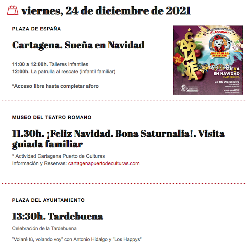 La plaza de España acoge esta mañana actividades infantils en ‘Sueña en Navidad’, mientras que en el Museo del Teatro Romano hay visitas guiadas para familias. A las 13.30 horas empieza la ‘Tardebuena’ en la plaza del Ayuntamiento con ‘Los Happys’ y Antonio Hidalgo. En el Polígono Santa Ana y en Pozo Estrecho estará hoy Papá Noel y en Alumbres hay cuentacuentos y pasacalles, actividades que también se dan en La Aparecida y La Puebla por la tarde.