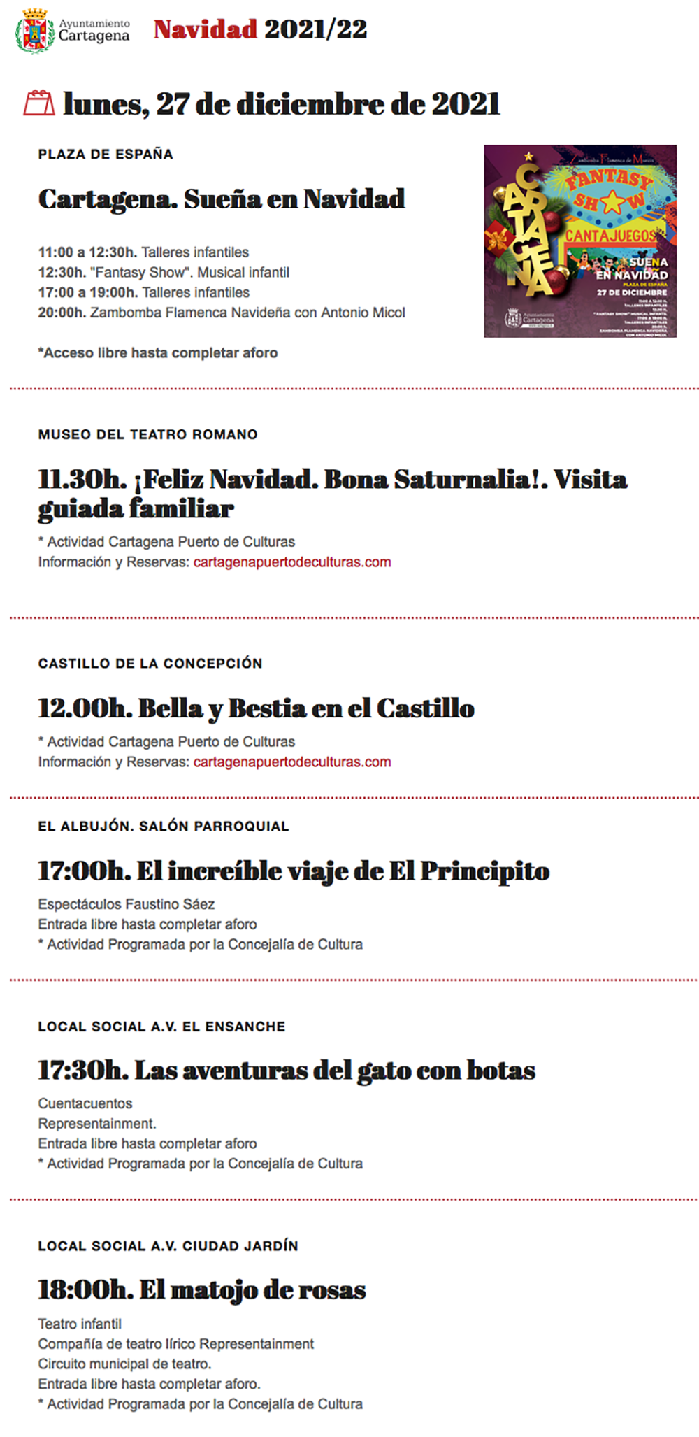 El circo de ‘Fantasy Show’ llega esta mañana a la plaza de España, donde también hay talleres y, por la tarde, una zambomba flamenca. En El Albujón hay doble propuesta, con festival infantil matinal y con ‘El Principito’ por la tarde, mientras que ‘el gato con botas’ estará en El Ensanche. Por su parte, Ciudad Jardín acoge a las líricas marionetas de ‘El matojo de rosas’. ’Bona Saturnalia’ sigue en el Teatro Romano, al igual que ‘Bella y Bestia’ en el Castillo de la concepción. Pasacalles en Los Camachos.