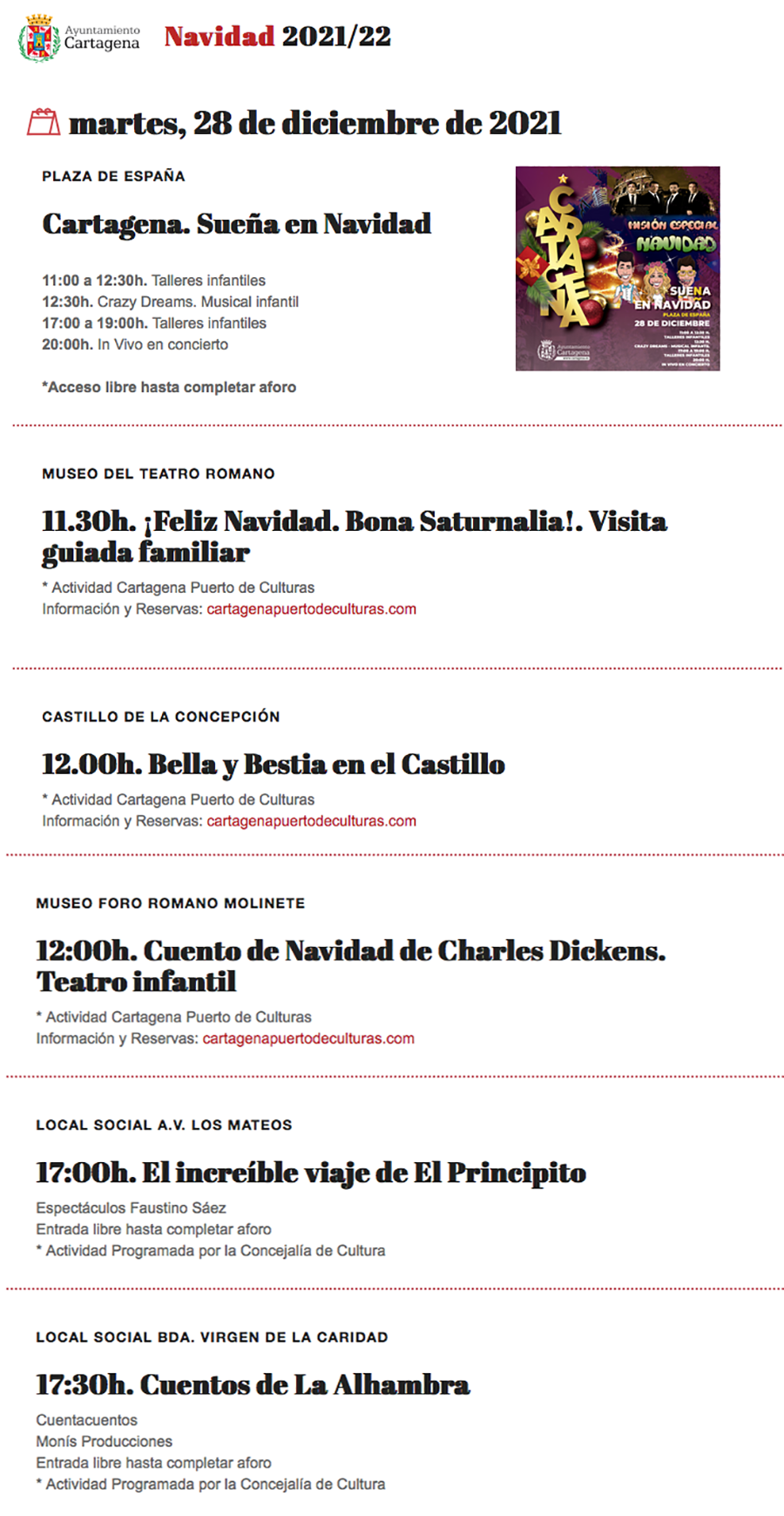 El musical infantil ‘Crazy Dreams’ y el concierto ‘In Vivo’ están hoy en la plaza de España, mientras que en el Museo del Foro romano hay teatro infantil con el ‘Cuento de Navidad’ de Charles Dickens. Fuera de la ciudad también hay relatos, con ‘El Principito’ en Los Mateos, el ‘Gato con botas’ en Alumbres y los ‘Cuentos de la Alhambra’ en la Barriada Virgen de la Caridad.