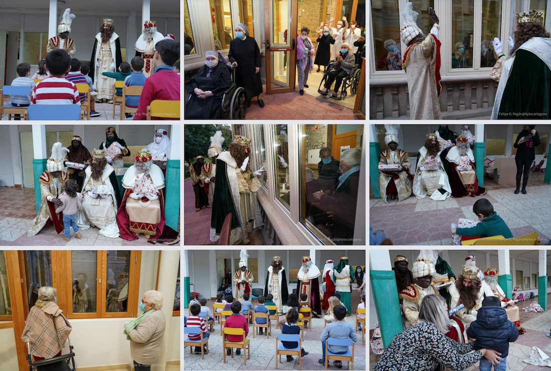 Los Reyes Magos, antes de montarse en sus carrozas para la cabalgata, han llevado a cabo la tradicional visita a la residencia de mayores del Barrio de la Concepción, donde han saludado a los usuarios a través de los cristales por seguridad anticovid, y han recogido las cartas de los pequeños del hogar de infancia.