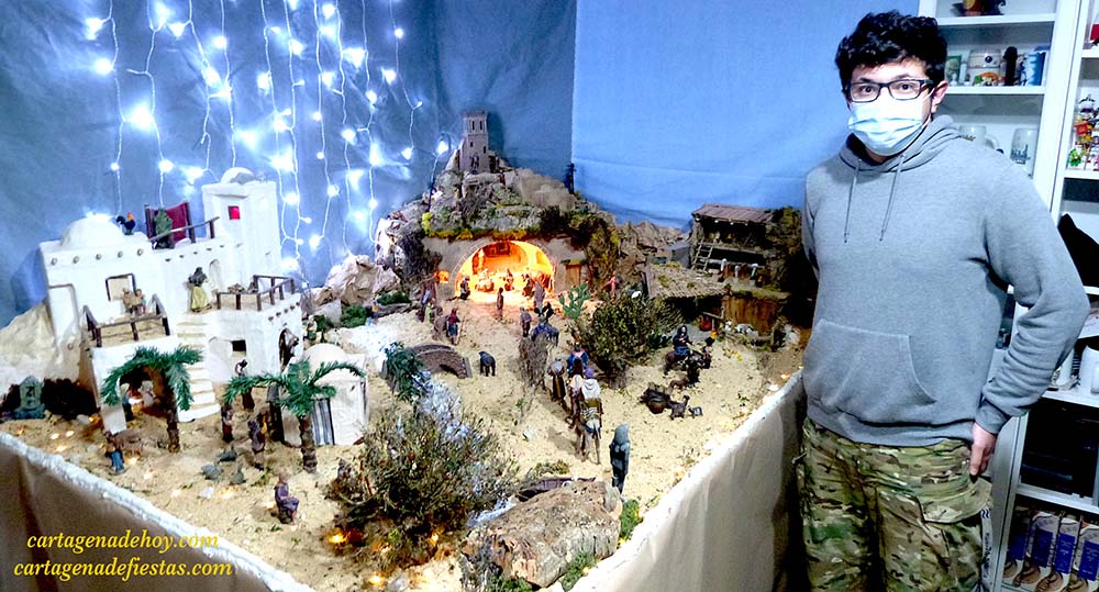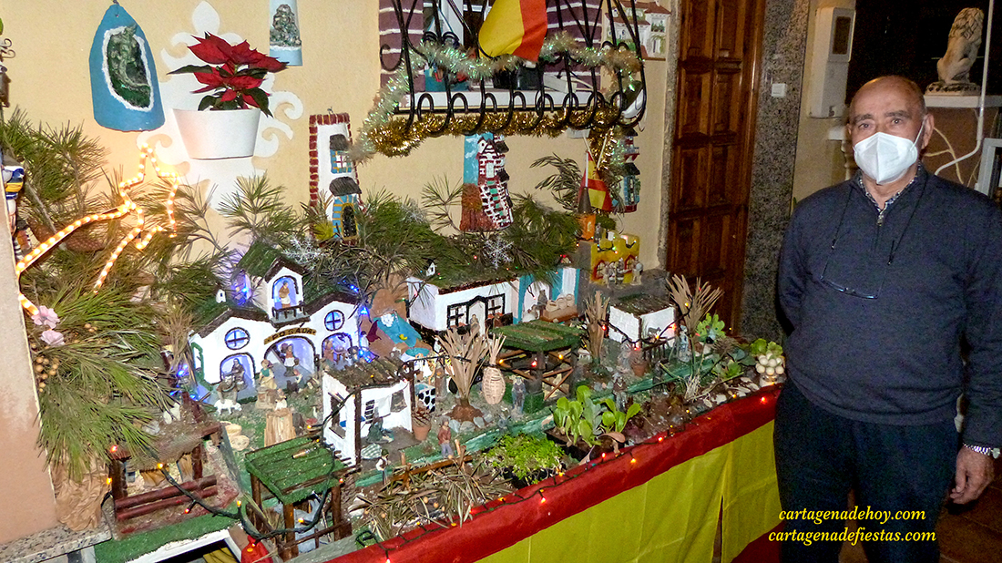 Cesáreo Vidal Costa se ha convertido en el primer vecino de Cartagena Norte que repite éxito en el concurso de belenes de Cartagena Norte que convoca la plataforma cultural El Castillito. Lo hizo en la primera edición, hace casi una década, y lo ha vuelto a conseguir ahora con un montaje llevado a cabo en la entrada de su jardín de la dolorense calle de Cuatro Santos (número 79), el cual puede ser visitado por los viandantes, tanto para contemplar las escenas como el sonido e iluminación que acompañan el trabajo. Lo montó el 8 de diciembre y lo mantendrá hasta San Antón (17 de enero). Cesárea lleva dos años montando el Nacimiento y es un gran enamorado de este mundillo belenista.